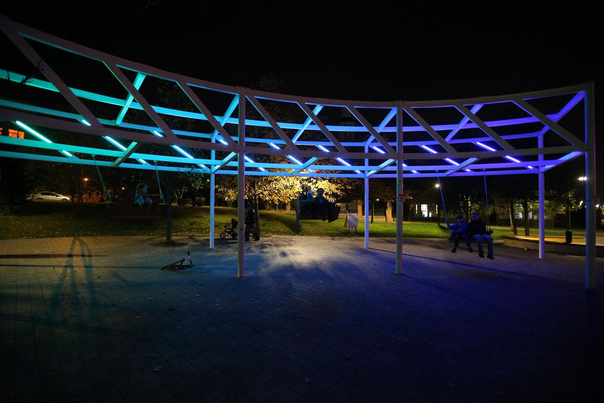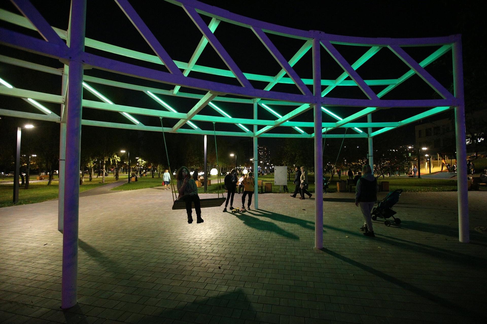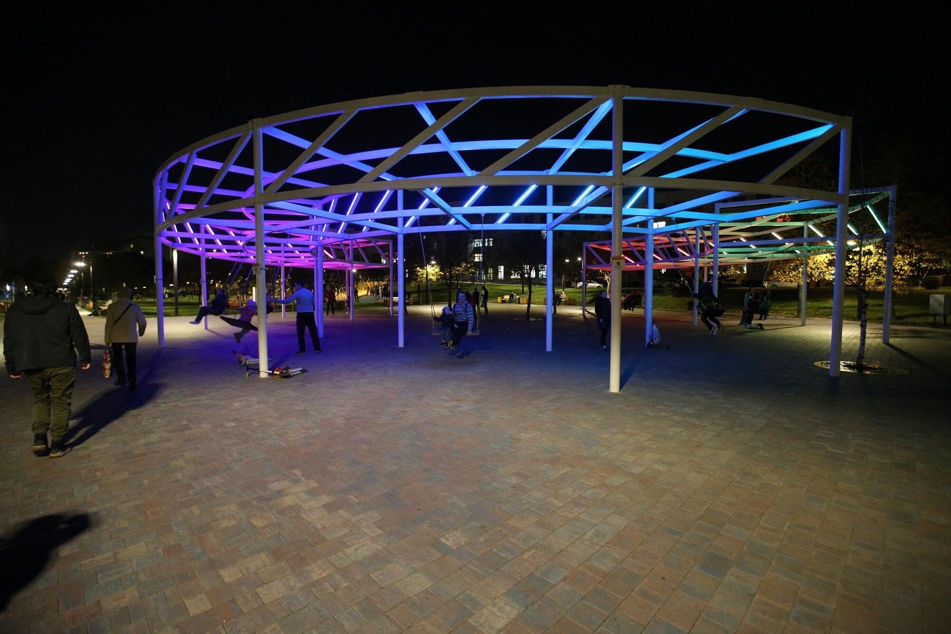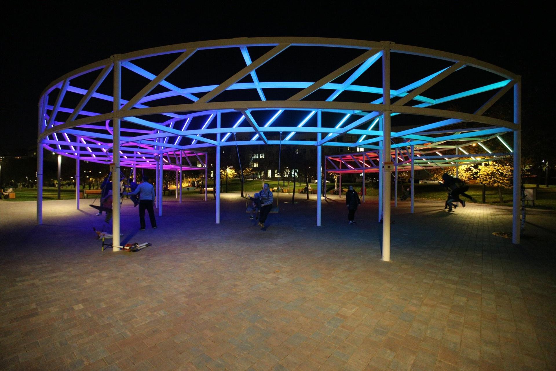 В парке установили большие круговые качели со светодиодной подсветкой, на которых могут качаться и дети, и взрослые. Выбор круглой, а не прямоугольной формы позволил избежать повреждения растущих рядом каштанов.