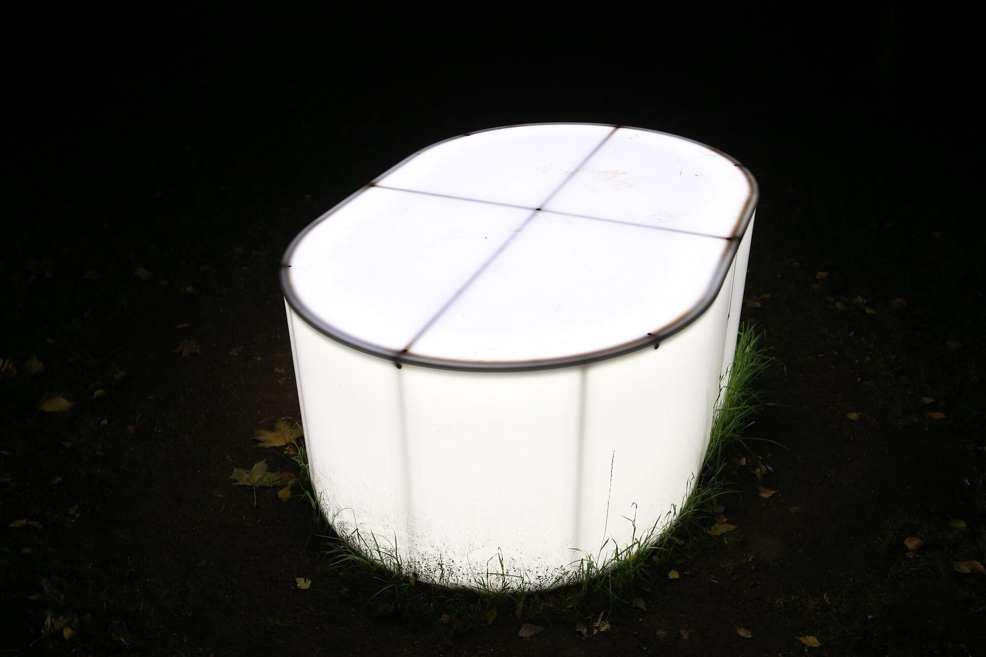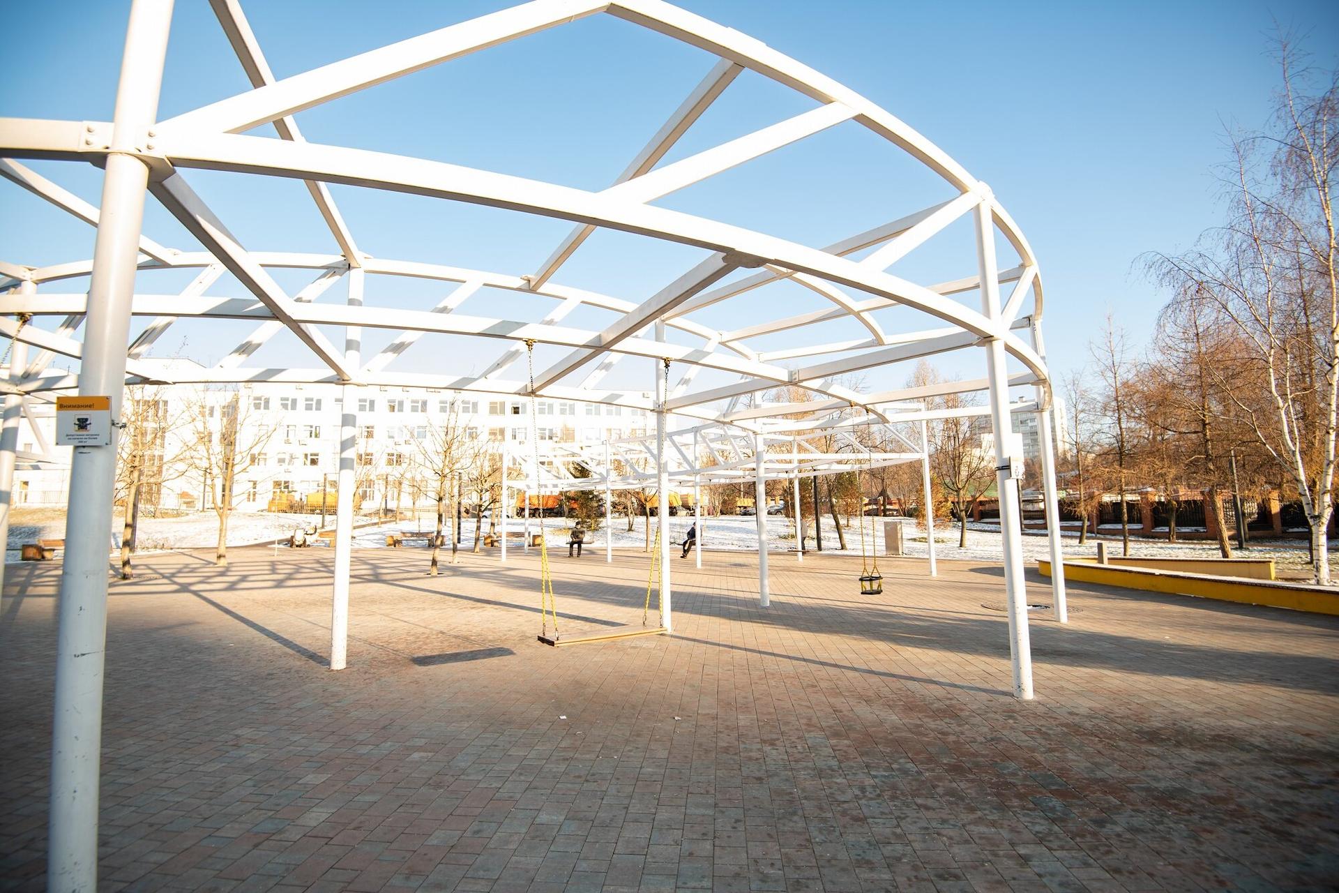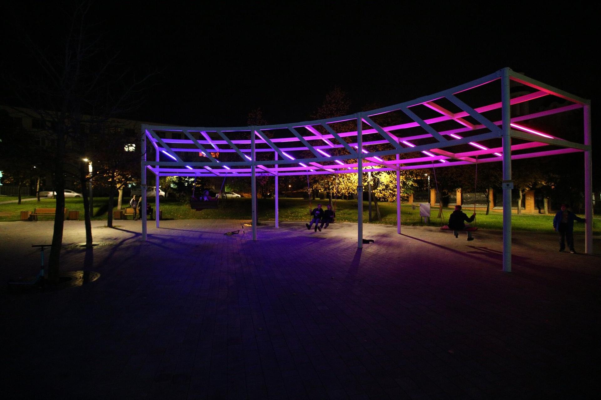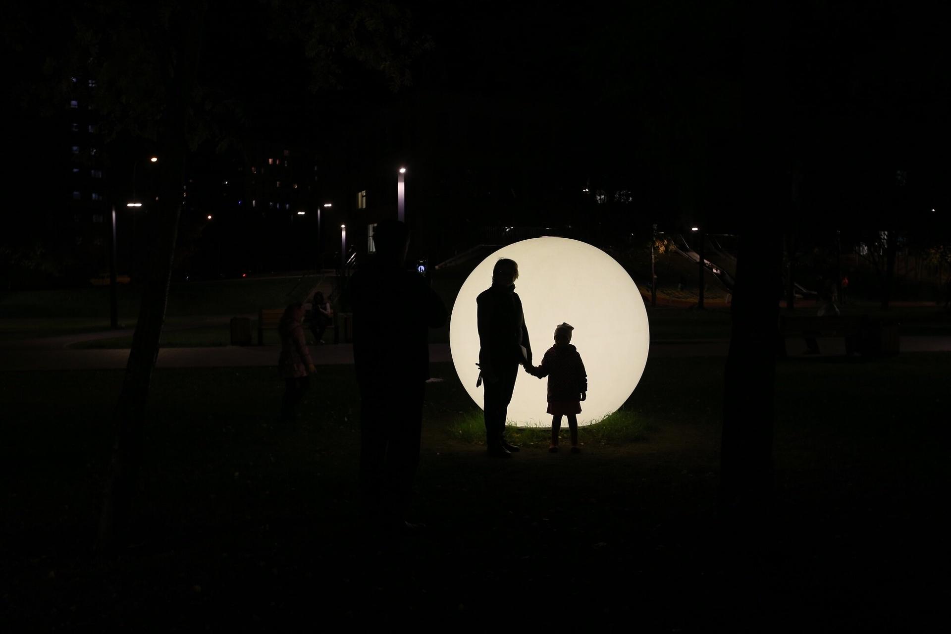 В парке установили большие круговые качели со светодиодной подсветкой, на которых могут качаться и дети, и взрослые. Выбор круглой, а не прямоугольной формы позволил избежать повреждения растущих рядом каштанов.