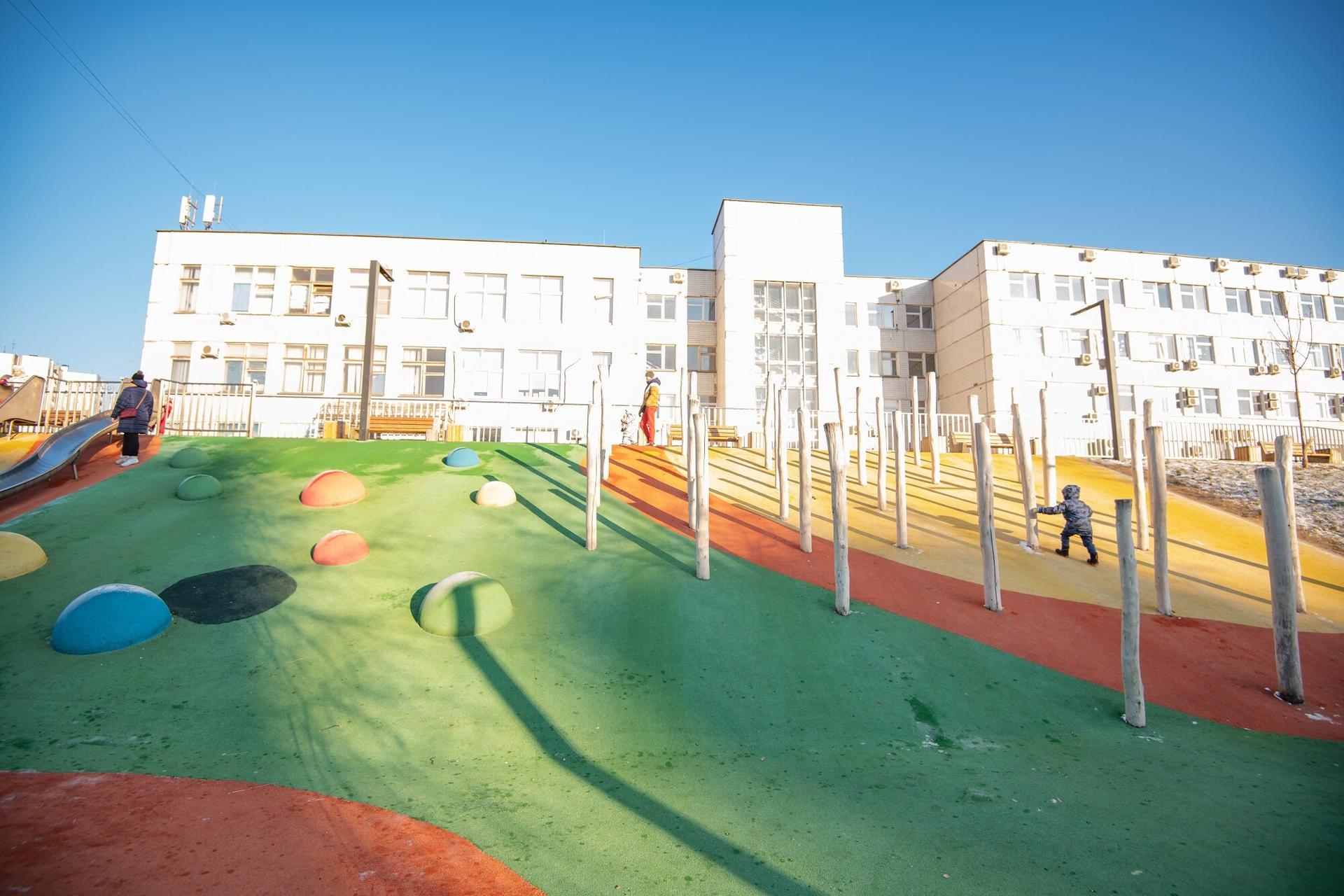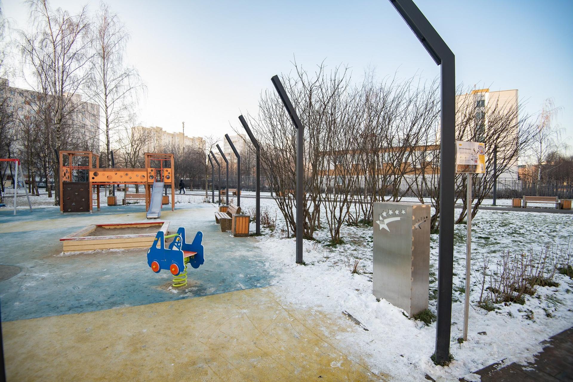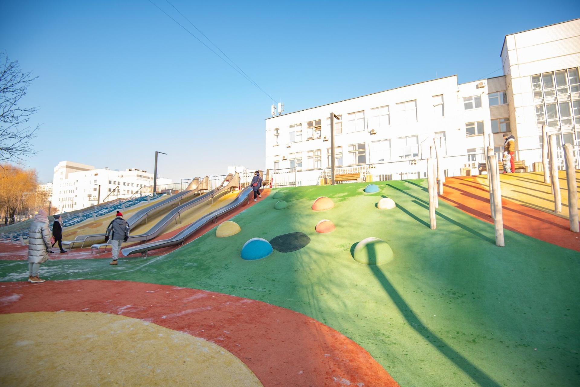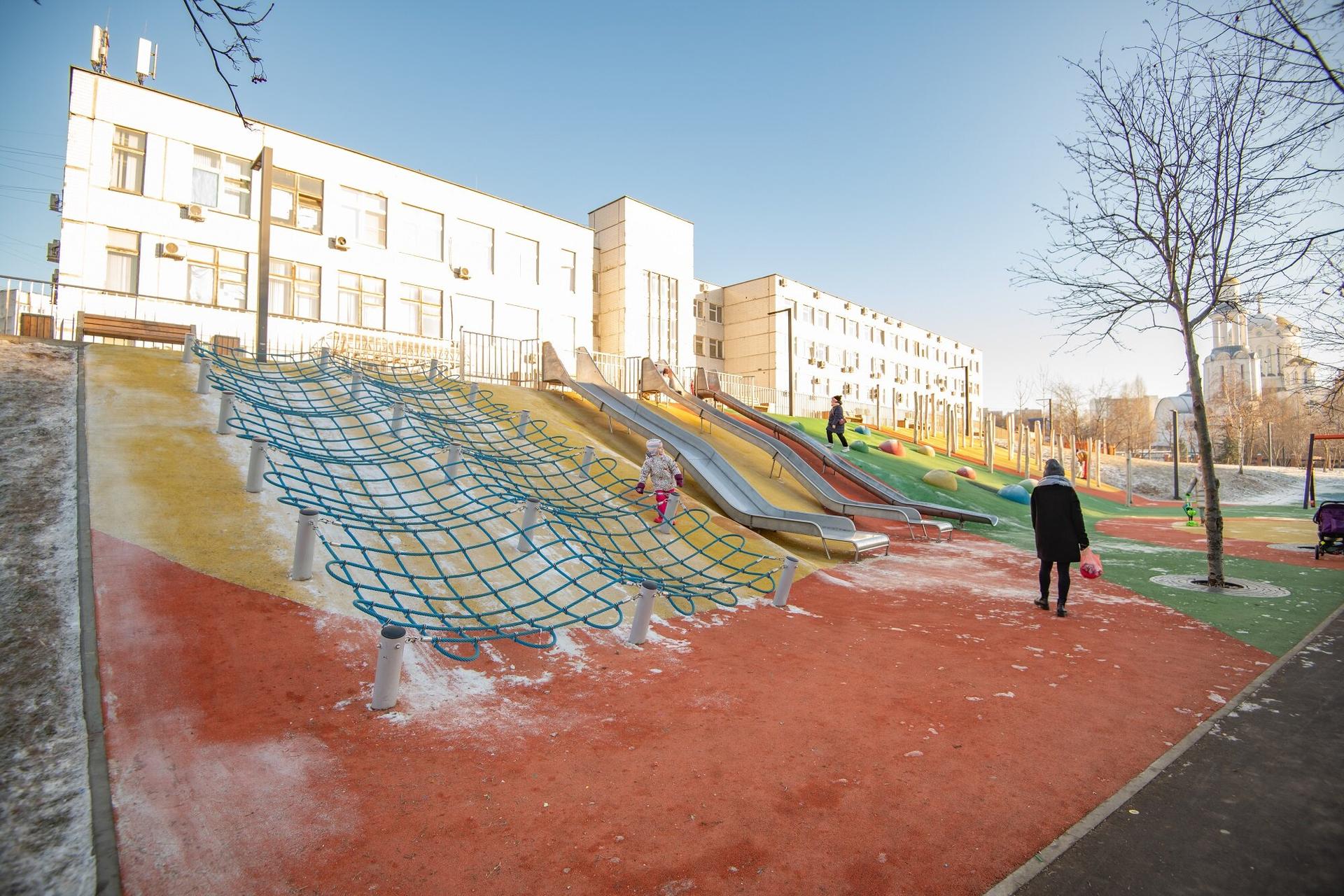 Для детского досуга также были обустроены две игровые площадки с подсветкой. Одну из них построили на склоне холма, чтобы не повредить находящиеся рядом деревья – она представляет собой единое игровое пространство с веревочными лестницами, горками, лазалками и тарзанкой. На второй площадке установили игровой комплекс с горкой и скалодромом, комплекс-паутинку, а также качели-гнезда.