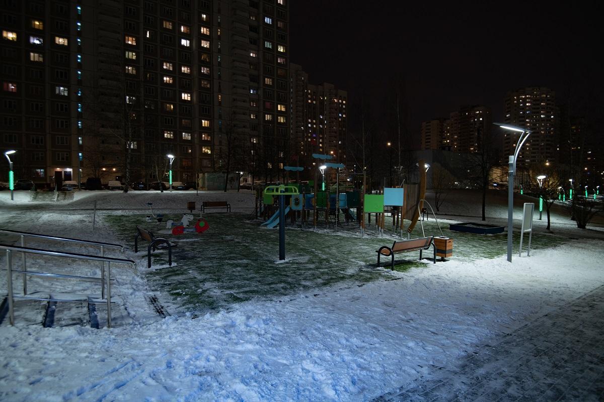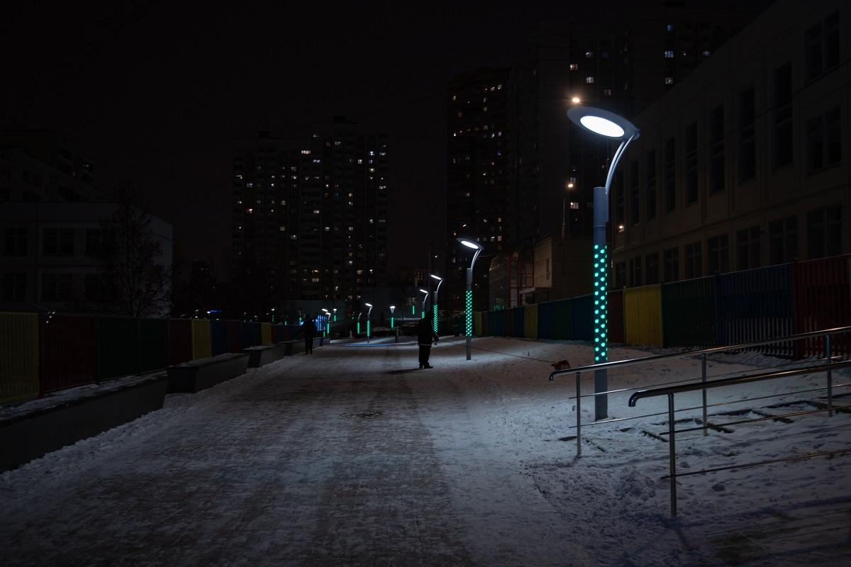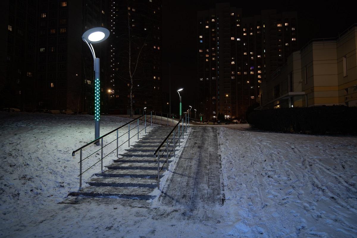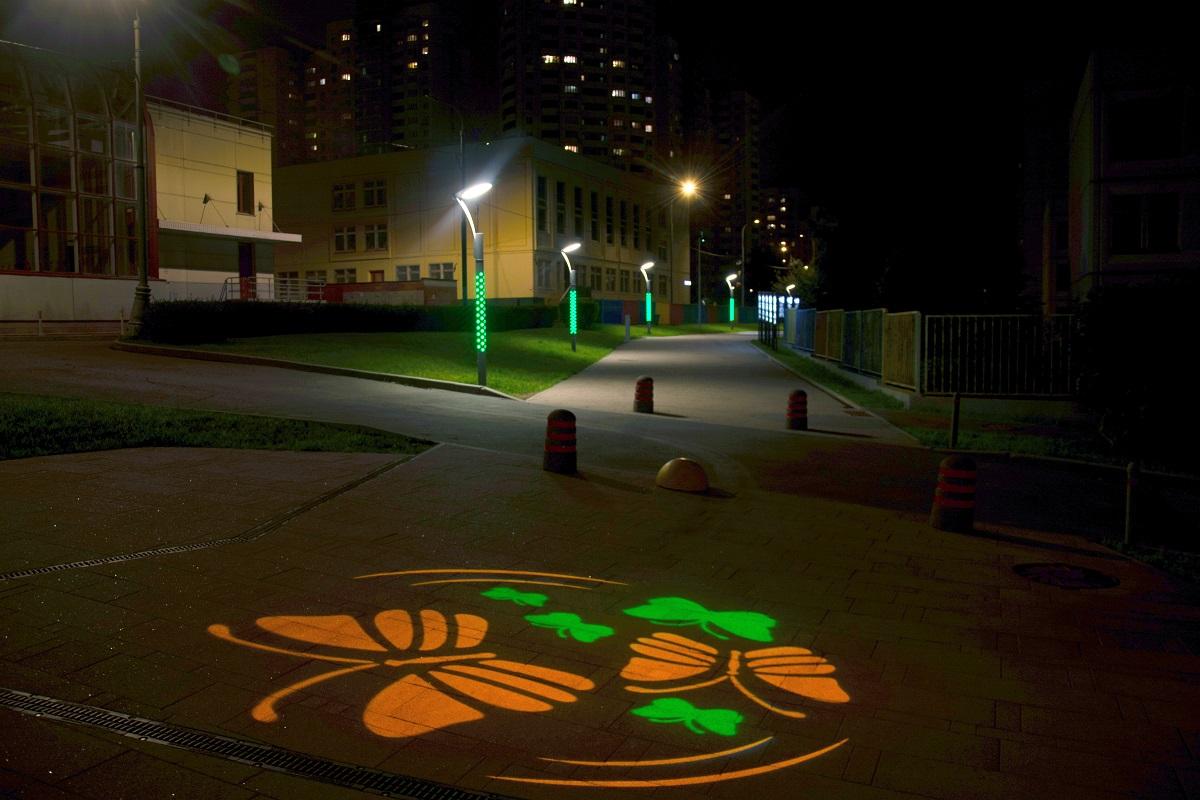 Пространство пешеходной зоны – многоуровневое: верхний и нижний уровни соединены здесь лестницами с пандусами для колясок. Между улицами Саморы Машела и Островитянова проходит широкая пешеходная тропа, вдоль которой установлены фонари с зеленой подсветкой и проекторами, «рисующими» разноцветные узоры на поверхности дорожки, а также скамейки и светящиеся круглые качели в форме луны. В части дворовой территории у дома 6 на улице Саморы Машела обустроены детская площадка с игровым комплексом в виде корабля, воркаут-площадка с тренажерами и столы для игры в настольный теннис.