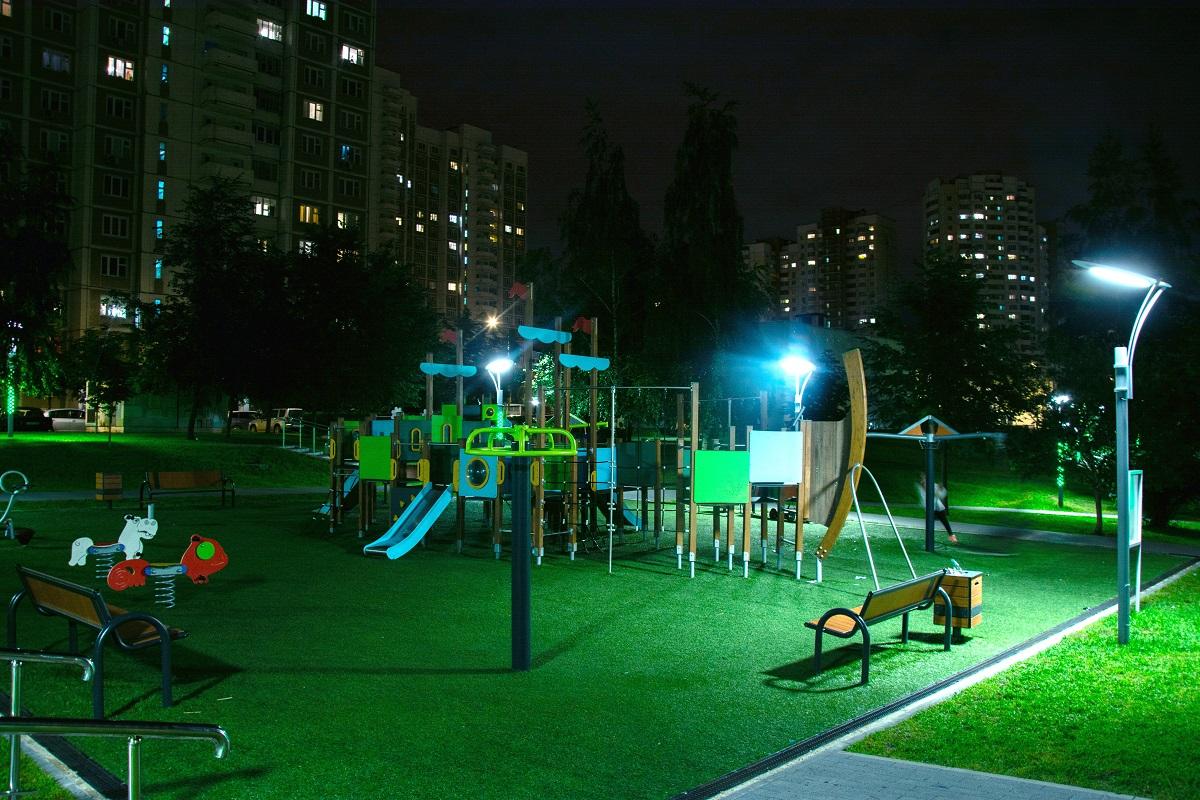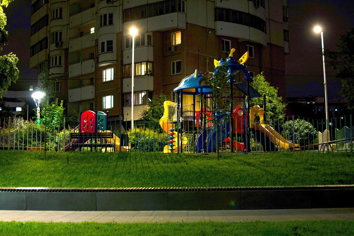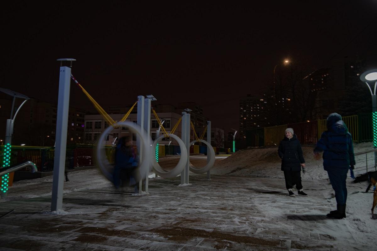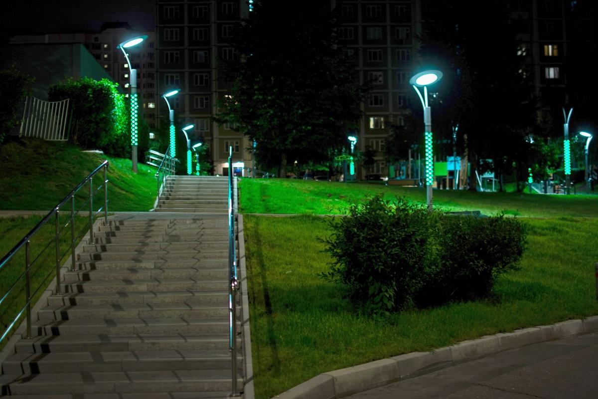 Пространство пешеходной зоны – многоуровневое: верхний и нижний уровни соединены здесь лестницами с пандусами для колясок. Между улицами Саморы Машела и Островитянова проходит широкая пешеходная тропа, вдоль которой установлены фонари с зеленой подсветкой и проекторами, «рисующими» разноцветные узоры на поверхности дорожки, а также скамейки и светящиеся круглые качели в форме луны. В части дворовой территории у дома 6 на улице Саморы Машела обустроены детская площадка с игровым комплексом в виде корабля, воркаут-площадка с тренажерами и столы для игры в настольный теннис.