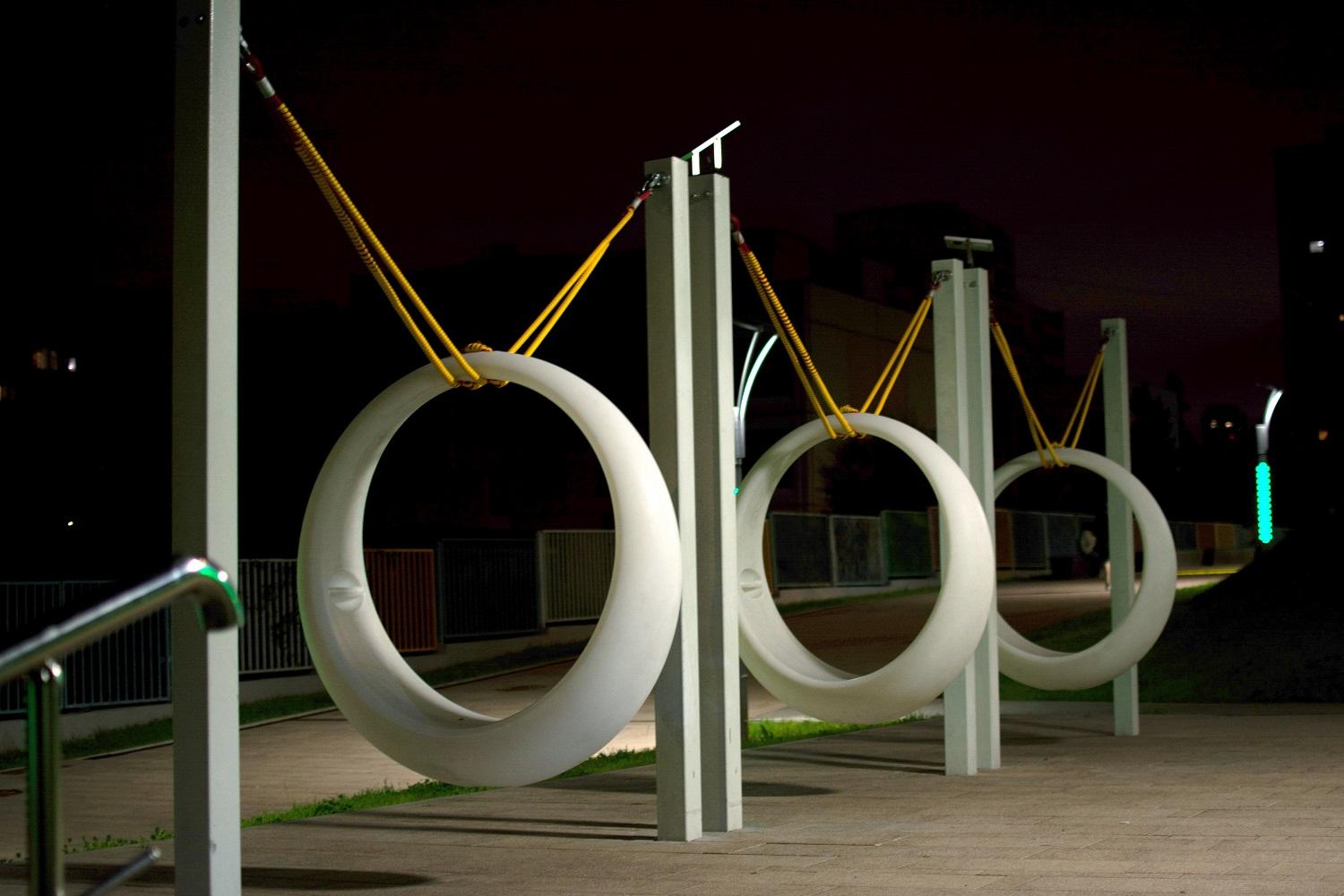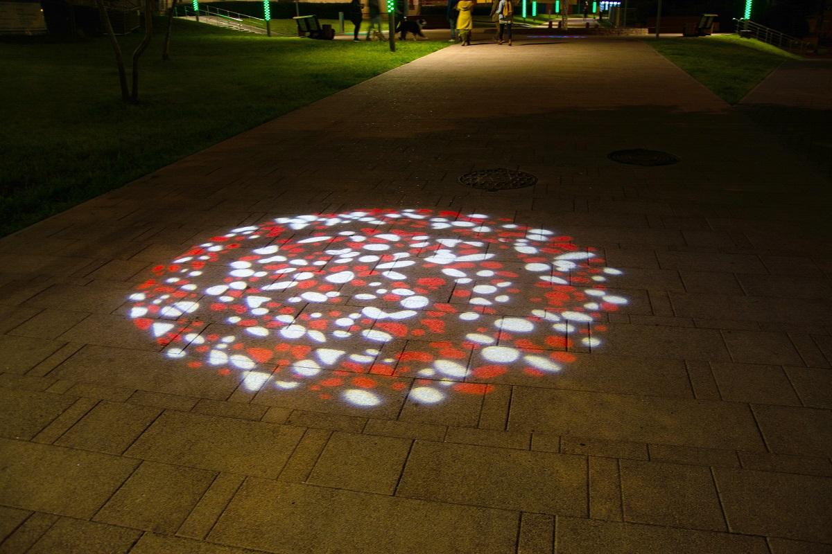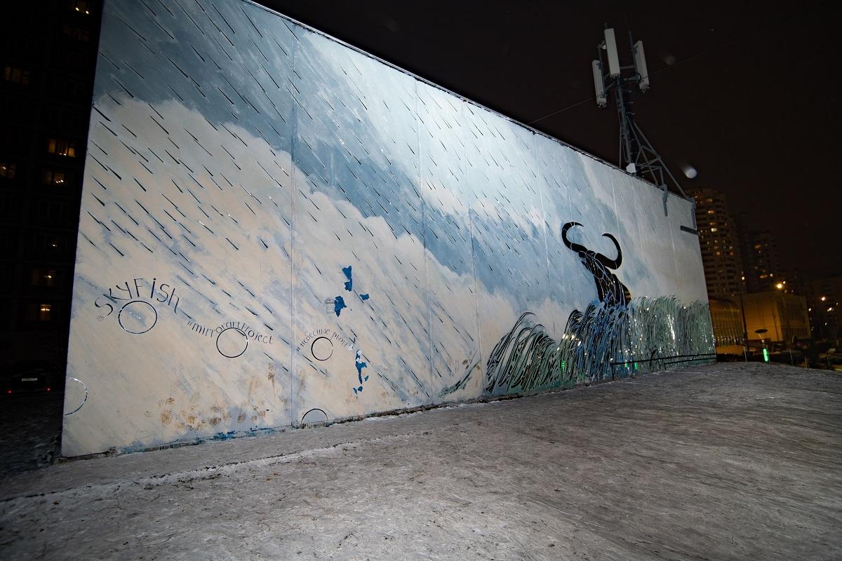 Неподалеку от детской площадки располагается тепловой пункт, на стене которого можно увидеть зеркальную мозаику проекта «Небесные рыбы». Она изображает стоящего под дождем в поле буйвола.