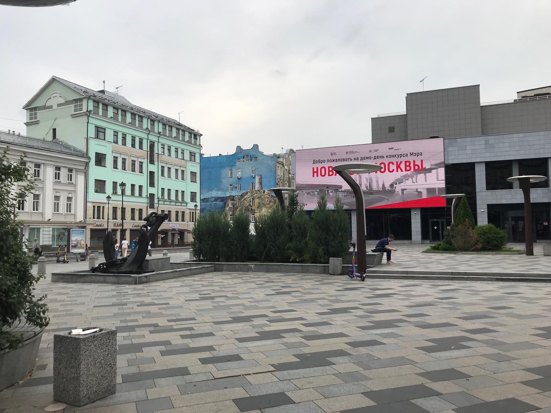 Таким образом, кинотеатр и площадь символически образовывали единое пространство. До сих пор в качестве доминанты здесь можно увидеть настоящий якорь из Цемесской бухты.