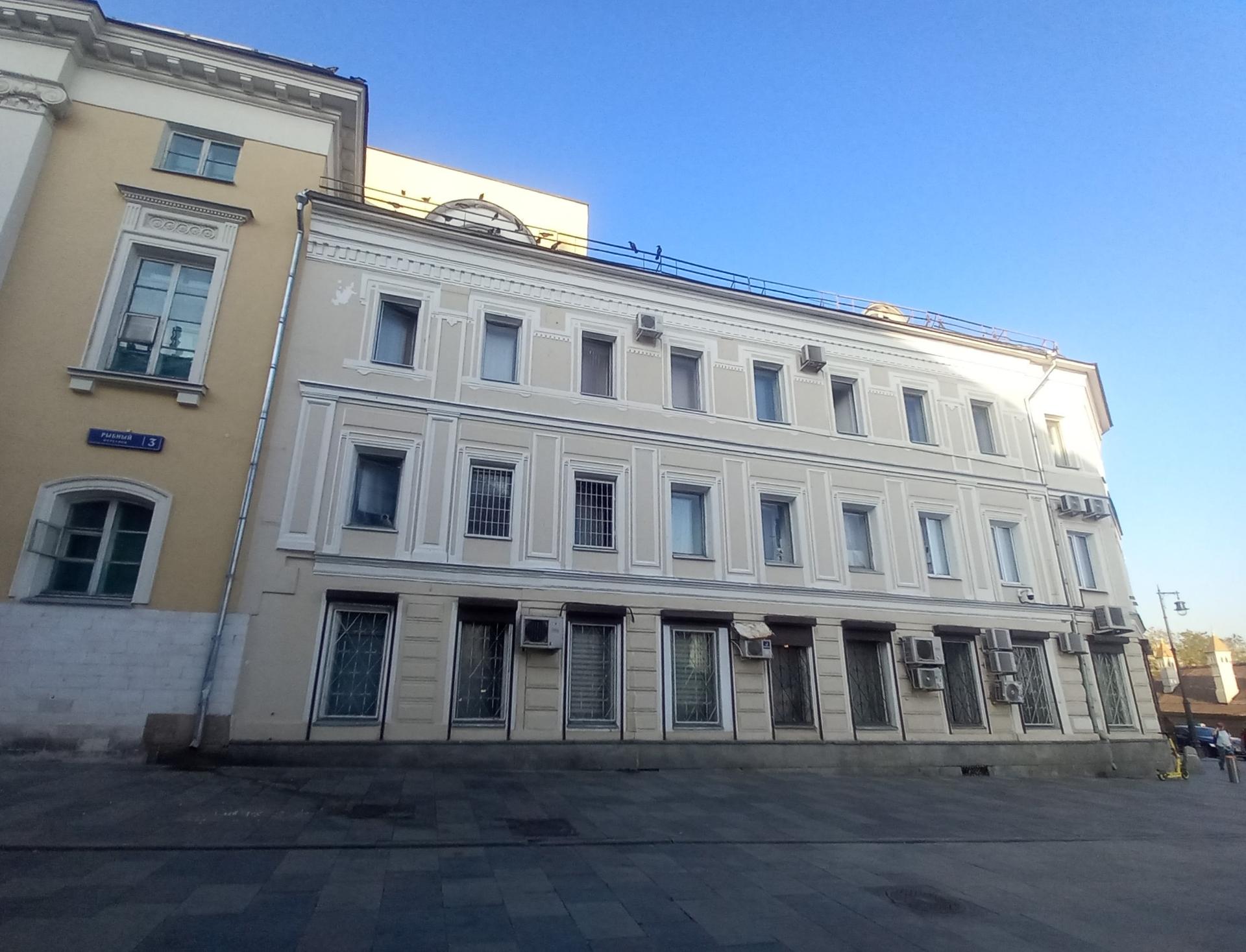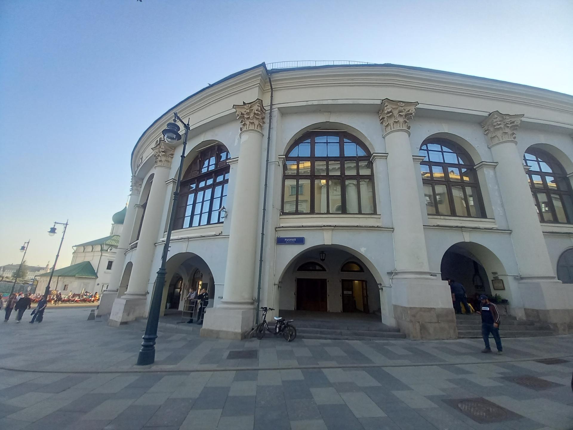 Рыбный переулок первоначально в XVII в. назывался Введенским по стоявшей в нём церкви Введения пресвятыя богородицы златоверхия. В XVIII в. — Магистратский переулок — по находившемуся в нём Главному магистрату. Назван по располагавшемуся здесь в XVIII — начале XIX вв. рыбному ряду. После строительства Старого (1791—1805; 1825—1830, проект Дж. Кваренги) и Нового (1838—1840) Гостиных дворов переулок фактически стал проездом между протяжёнными фасадами этих зданий.