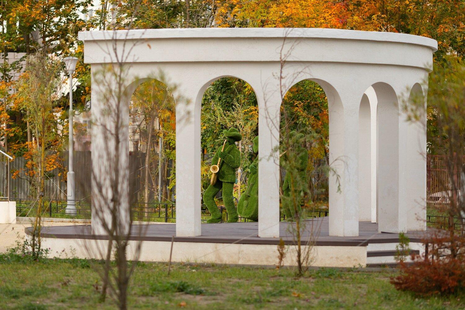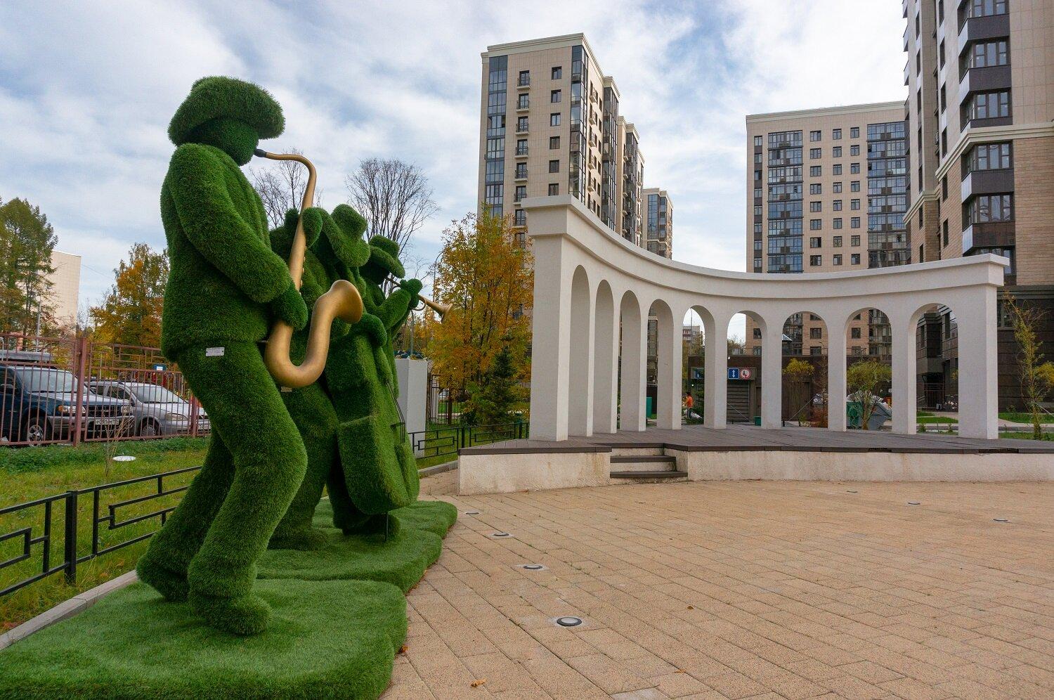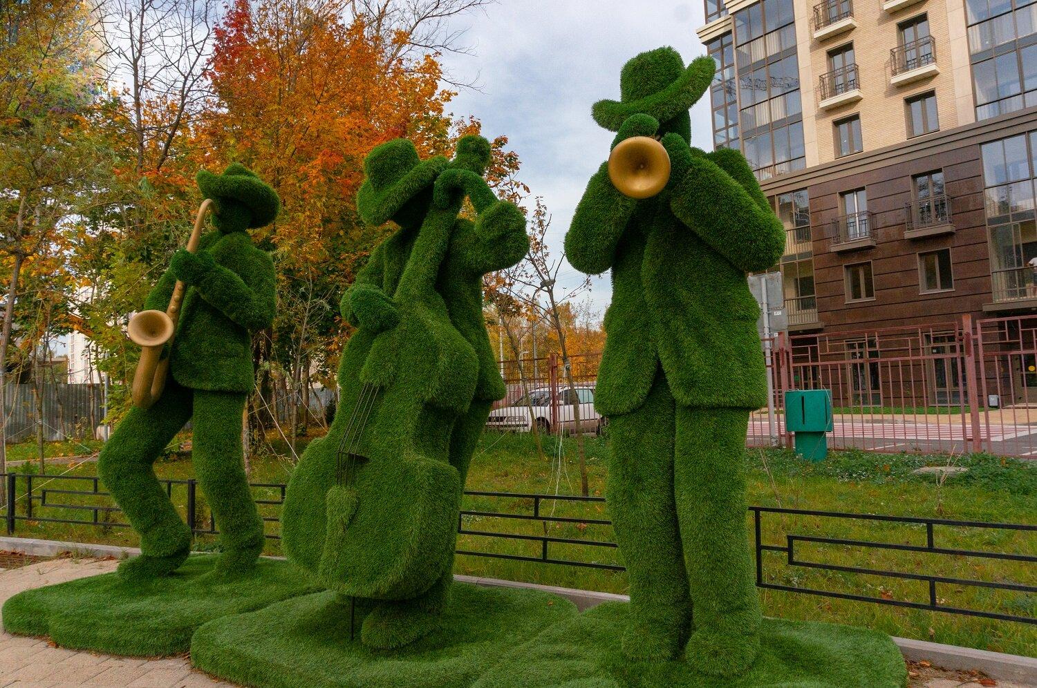 В сквере «Флейта» размещена зона отдыха со сценой и амфитеатром для зрителей. Рядом установлена группа топиарных фигур в виде джазового ансамбля: саксофониста, контрабасиста и трубача. Всё зелёное пространство по вечерам освещено фонарями.