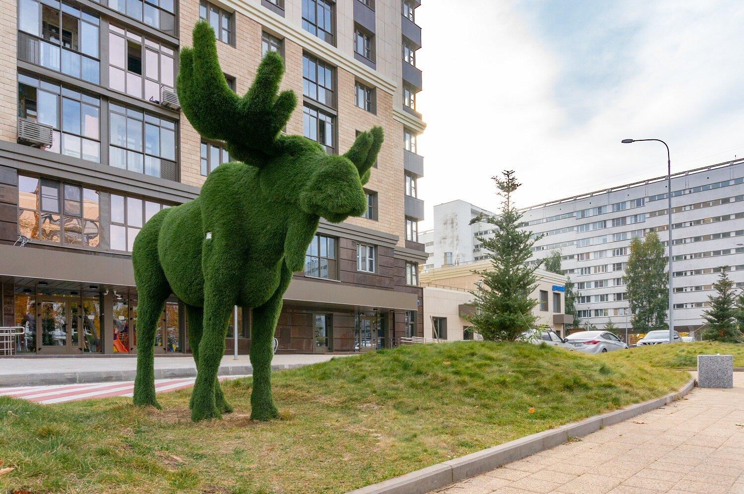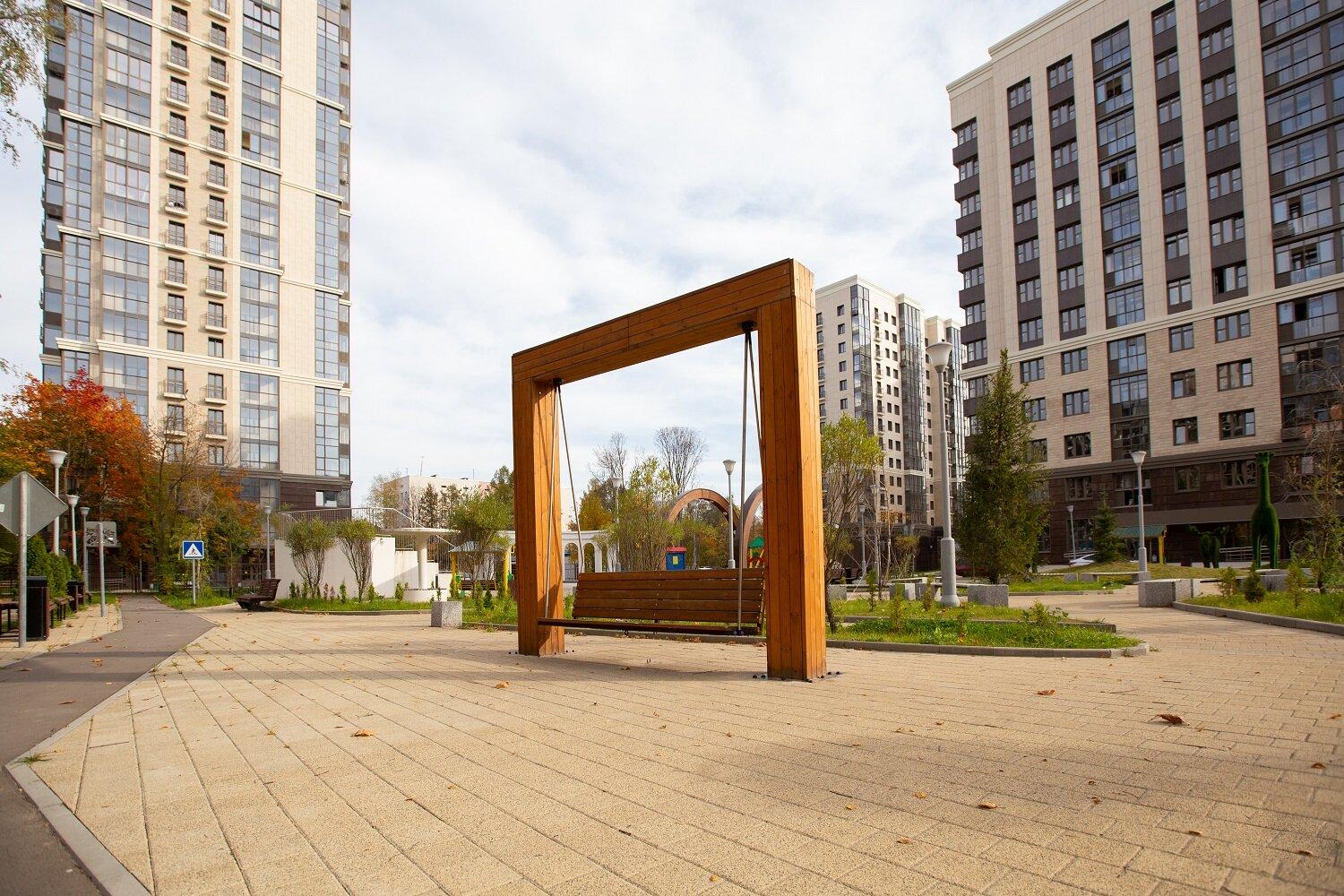 Центральная аллея сквера украшена арками и парковыми диванами. По всей территории проложена велодорожка. В сквере установлены две детские площадки. Одна из них – с качелями-гнездами и игровым городком в виде корабля с лазалками и горкой. Также здесь обустроены зоны для тихого отдыха с круговыми скамейками и навесами и большими качелями. На территории сквера установлены топиарные фигуры животных.
