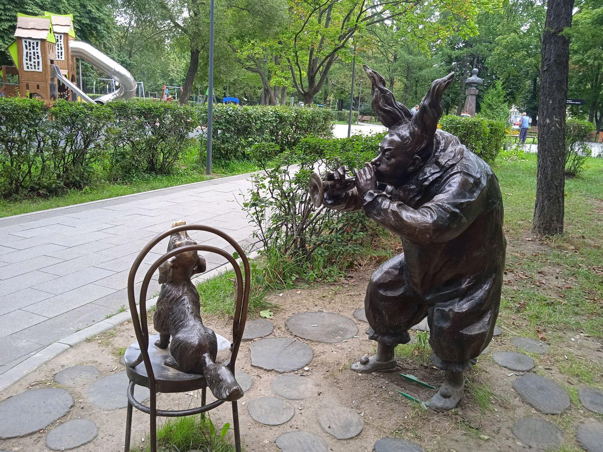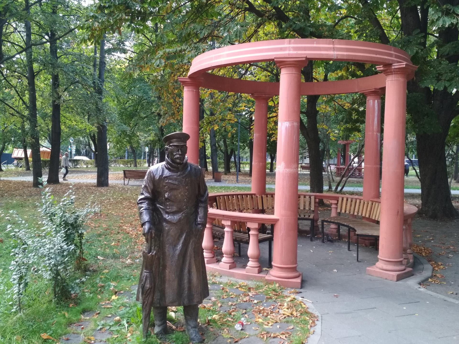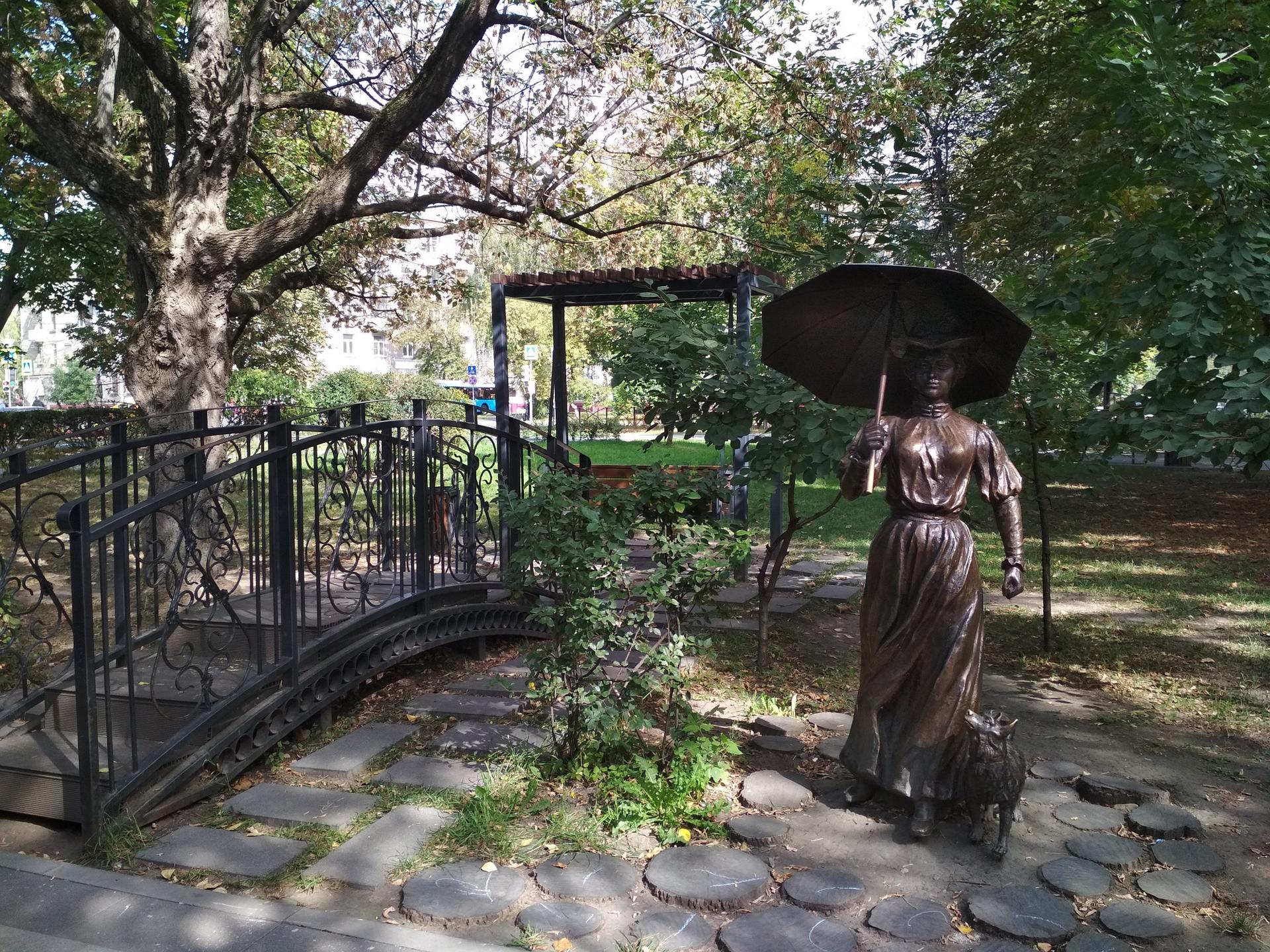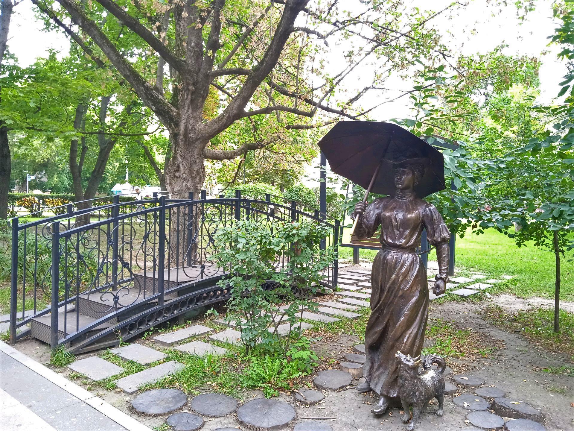 Помимо бюста Чехова на территории установлены деревянные скульптуры в виде персонажей из знаменитых рассказов классика: «Дама с собачкой», «Каштанка», «Человек в футляре», «Лошадиная фамилия». У одной из скамеек находится и деревянная фигура самого писателя. Автором работ стал мастер Валерий Иванников.