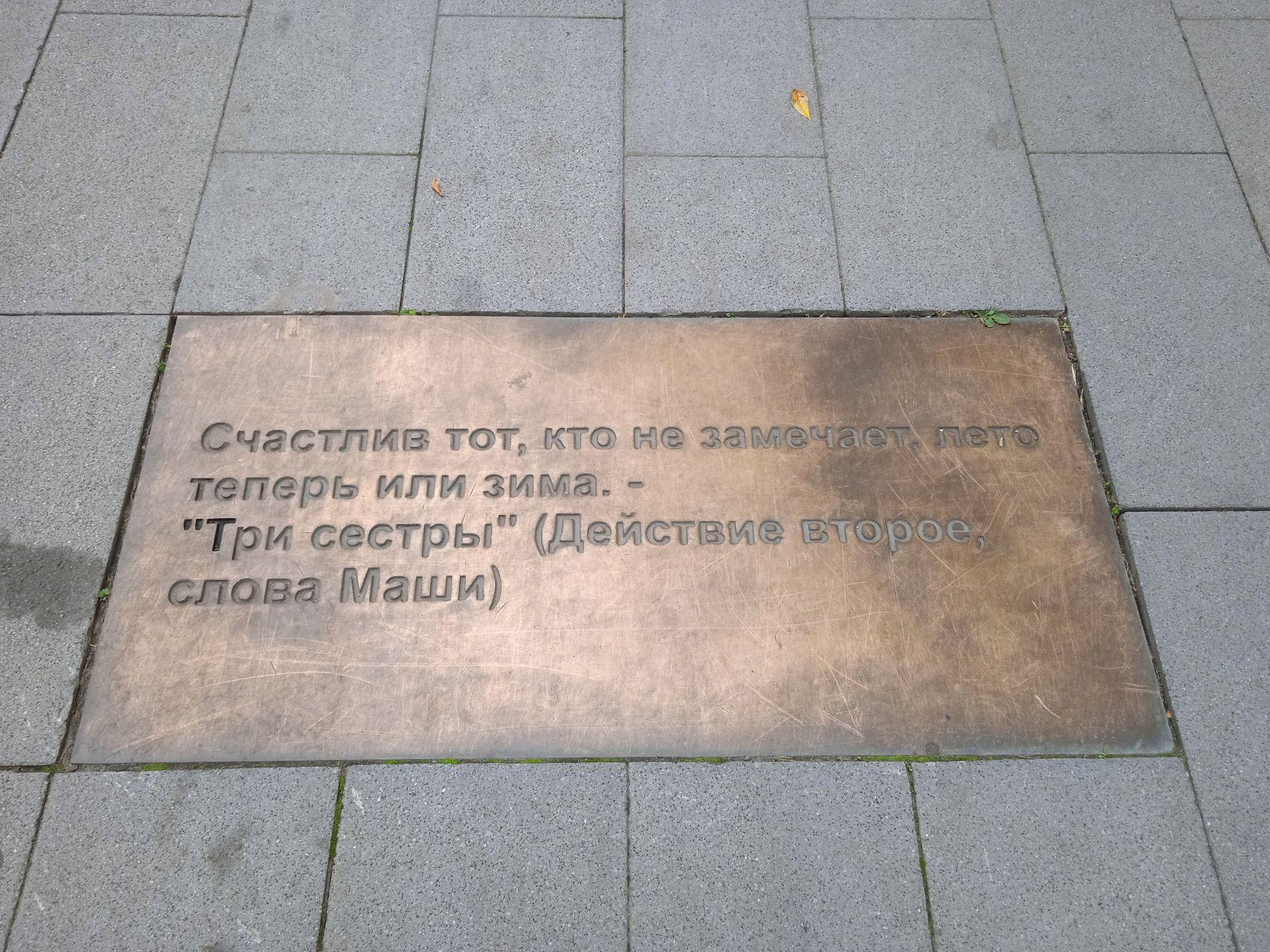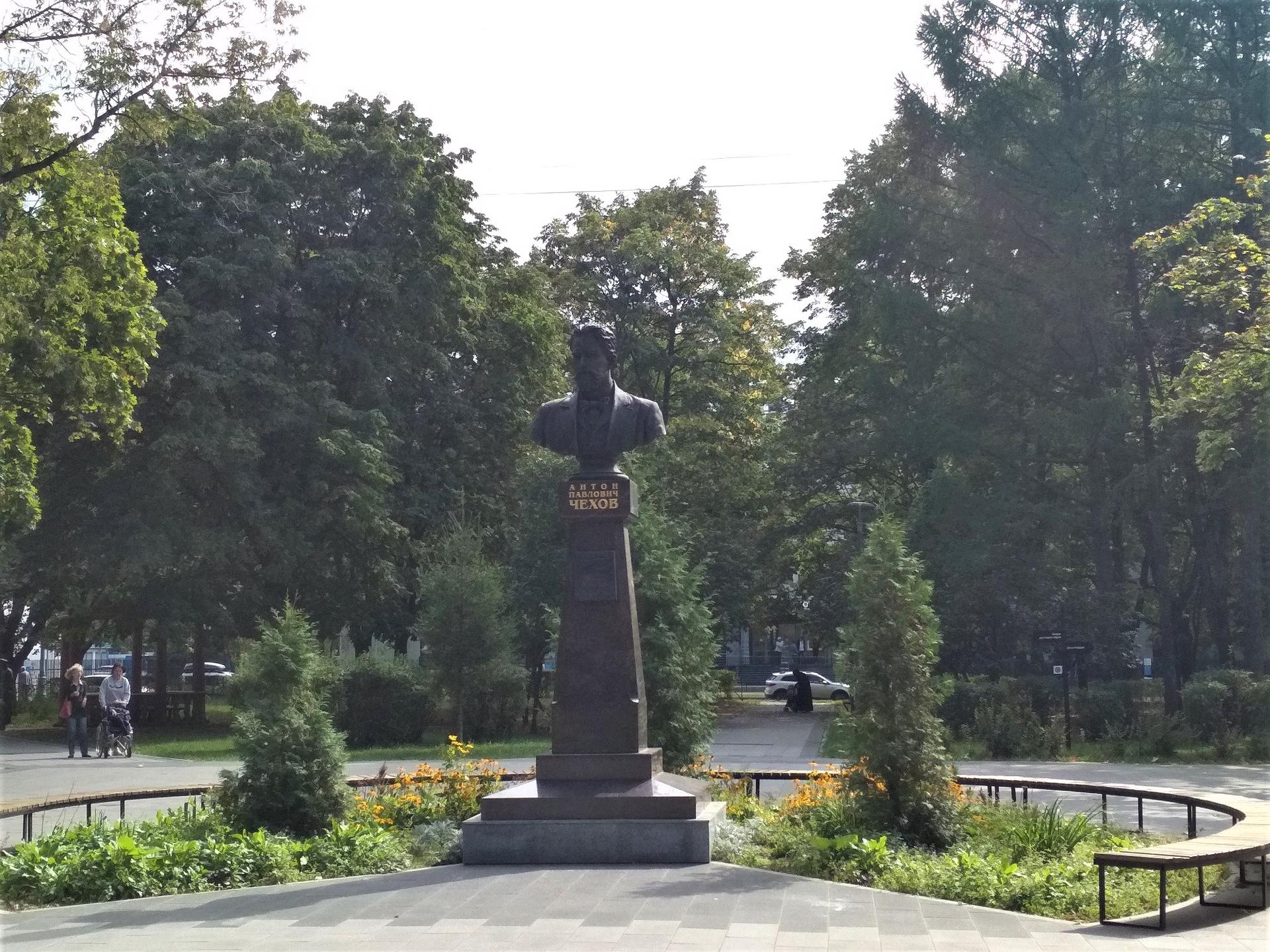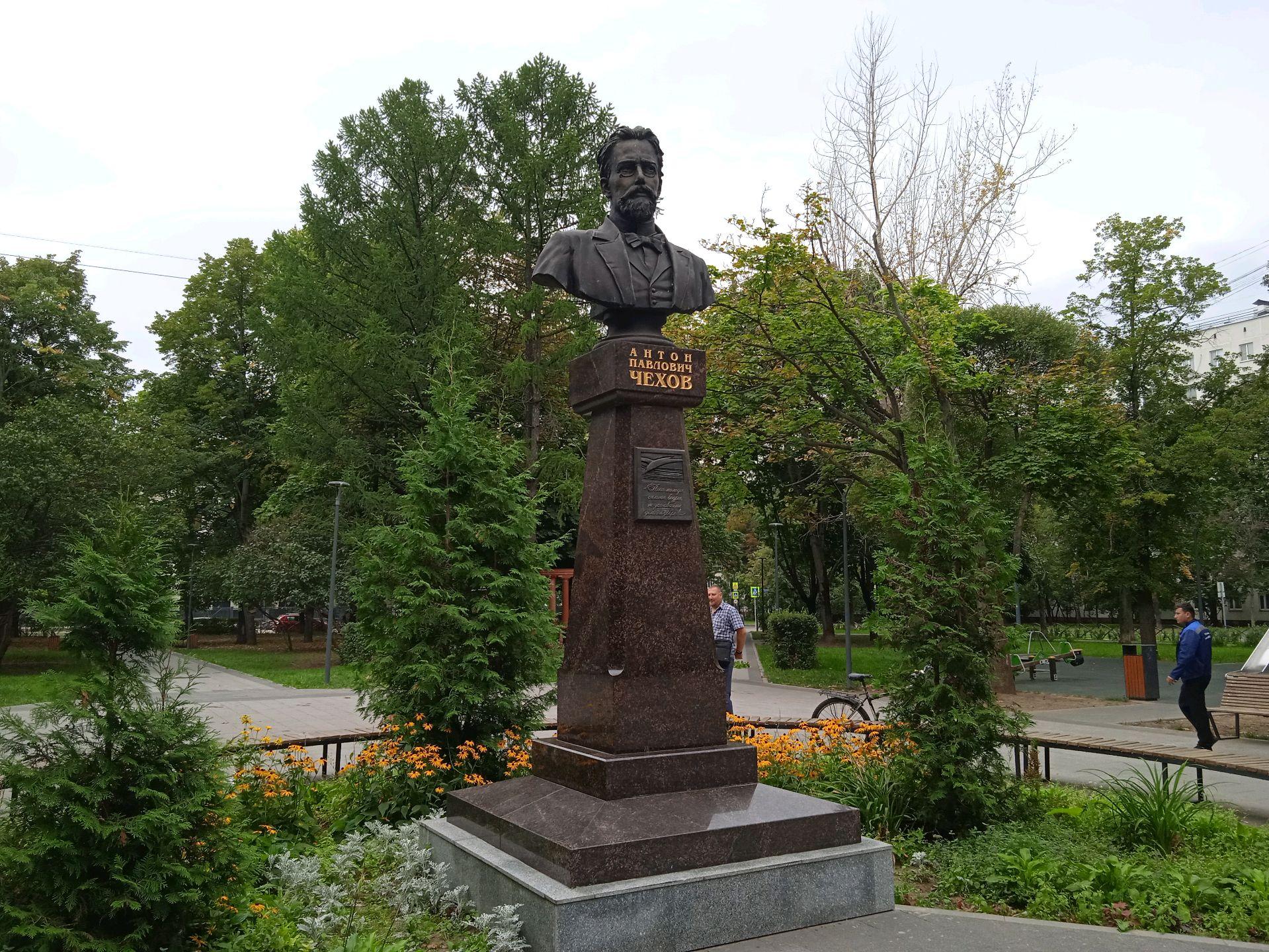 Доминантой пространства стал бюст А.П. Чехова, который расположен в центре сквера. Монумент установлен в 2014 году. Его автором стал скульптор Салават Щербаков. Памятник украшает фраза: «Пока молоды, сильны, бодры, не уставайте делать добро!...». Слова принадлежат одному из героев чеховского рассказа «Крыжовник».
