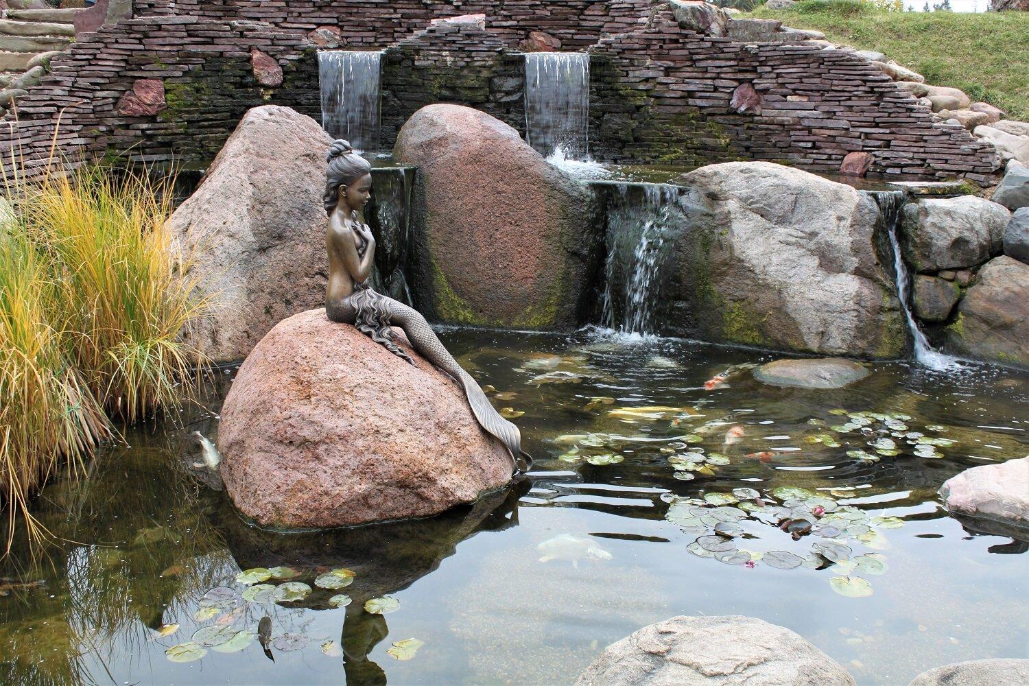 Зона отдыха выполнена в средиземноморском стиле. На территории есть небольшой водопад с искусственными прудами и альпийской горкой. Сквер украшают бронзовые скульптуры. В тёплое время года в водоёмы выпускают красноухих черепах и рыб.
