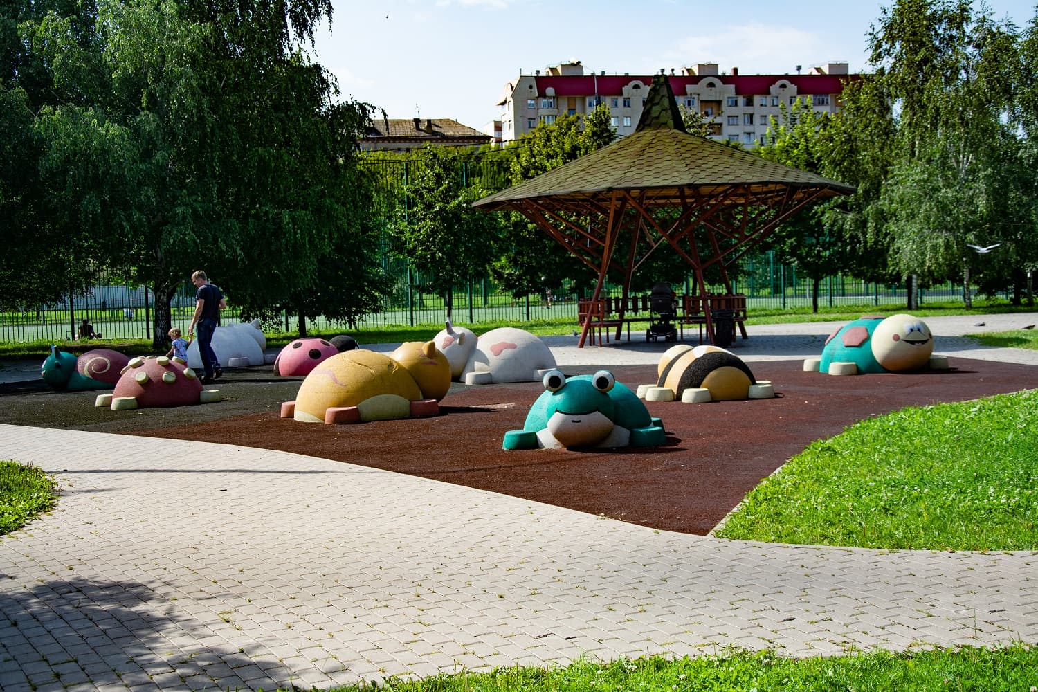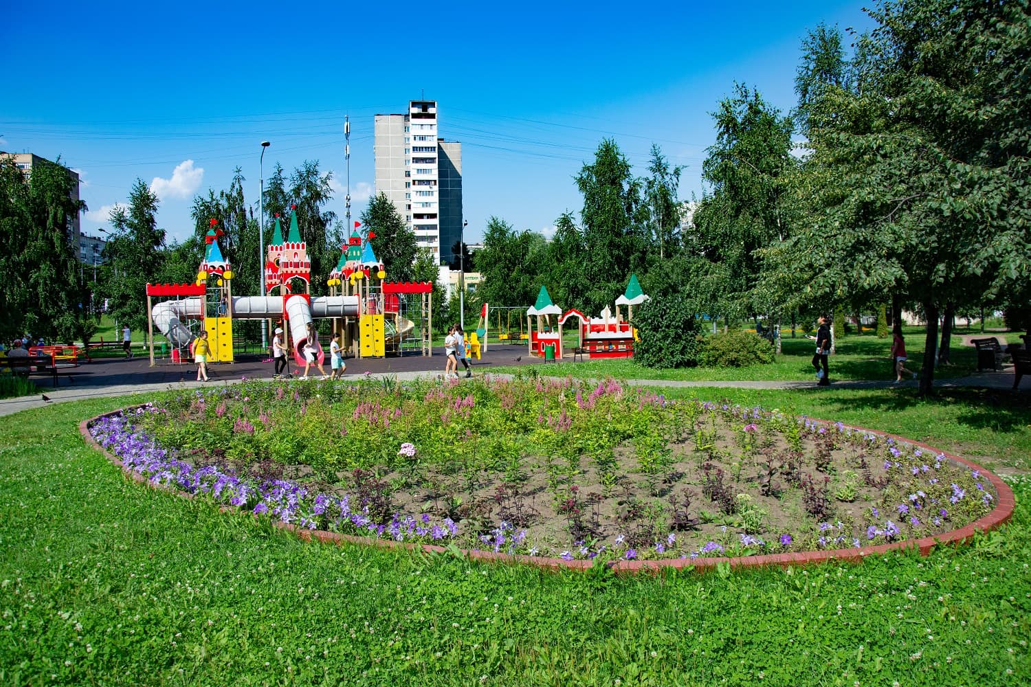 Ближе к метро обустроена спортивная зона с футбольным и баскетбольным полями, а также площадкой для воркаута. У церкви находится зона тихого отдыха, по периметру которой установлены деревянные парковые диваны.