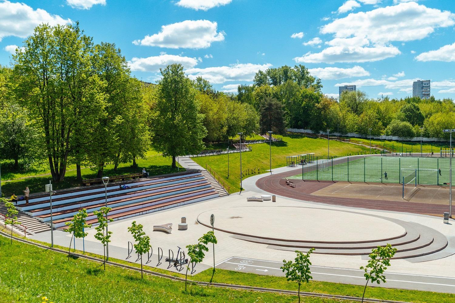 Главная достопримечательность спортивной зоны – футбольное поле с трибунами и беговыми дорожками. Его площадь составляет 2816 квадратных метров. Здесь также расположены площадки с тренажерами, площадка для сдачи норм ГТО, волейбольное поле и воркаут. Рядом разместили хоккейную коробку и площадку для игры в «Городки». В летнее время хоккейная площадка используется как поле для игры в мини-футбол.