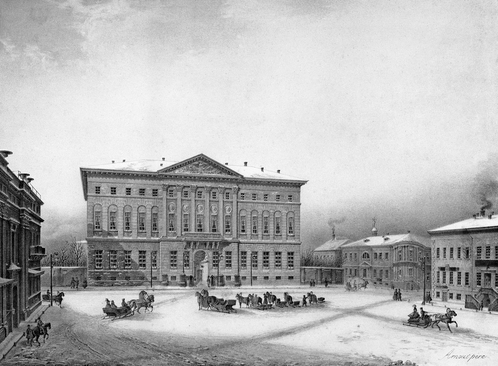 После пожара 1812 года казна выкупила еще одно владение, теперь уже за площадью: в 1823 году там была выстроена Тверская полицейская часть, двухэтажное классицистическое здание с шестиколонным портиком, центральная часть которого венчалась деревянной каланчей – обязательным элементом всех полицейских домов Москвы. Помимо полицейского управления, здесь размещалась пожарная команда и тюрьма, в стенах которой среди прочих арестантов некоторое время провели композитор А.А. Алябьев в 1825 году и драматург А.В. Сухово-Кобылин в 1854 году.