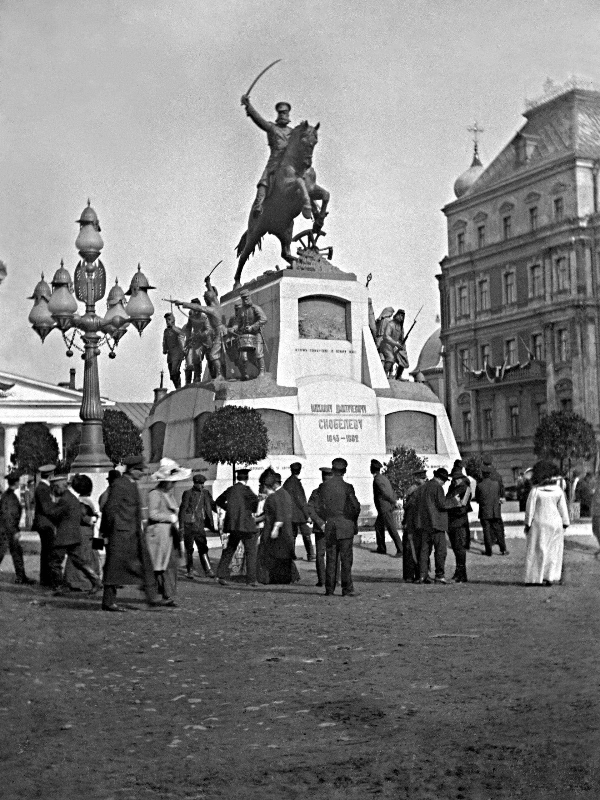 24 июня 1912 года на площади был торжественно открыт памятник покорителю Средней Азии, герою Русско-турецкой войны 1877–1878 годов М.Д. Скобелеву работы скульптора П.А. Самсонова, изображающий «Белого генерала» на коне и с обнаженной саблей, украшенный скульптурными группами солдат и барельефами с изображениями военных баталий. Одновременно и площадь получила новое название – Скобелевская. Простоял монумент недолго: через 6 лет, в 1918 году, советская власть в рамках кампании по снятию старых памятников русским императорам и героям дореволюционной эпохи снесла и фигуру Скобелева.