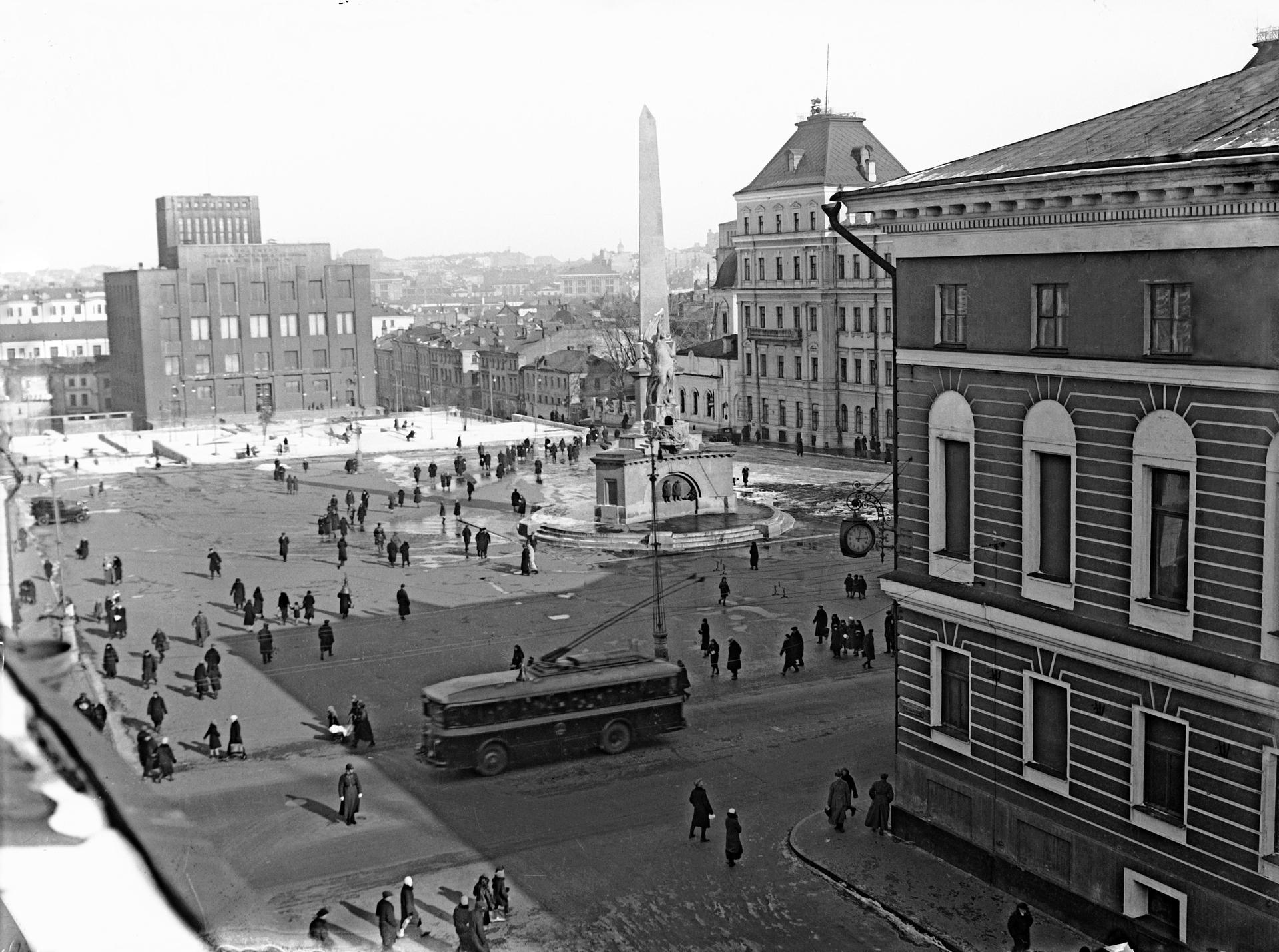 Обелиск и Статуя Свободы были взорваны в ночь с 21 на 22 апреля 1941 года, за два месяца до начала Великой Отечественной войны – по официальной версии, в рамках реконструкции улицы Горького. Пустовала площадь недолго: в 1947 году на ней в рамках празднования 800-летия Москвы был заложен памятник князю Юрию Долгорукому, который торжественно открыли в 1954 году. Чуть ранее был надстроен бывший генерал-губернаторский дом, ставший местом заседаний Моссовета. После этого значительных изменений в облике площади более не происходило.