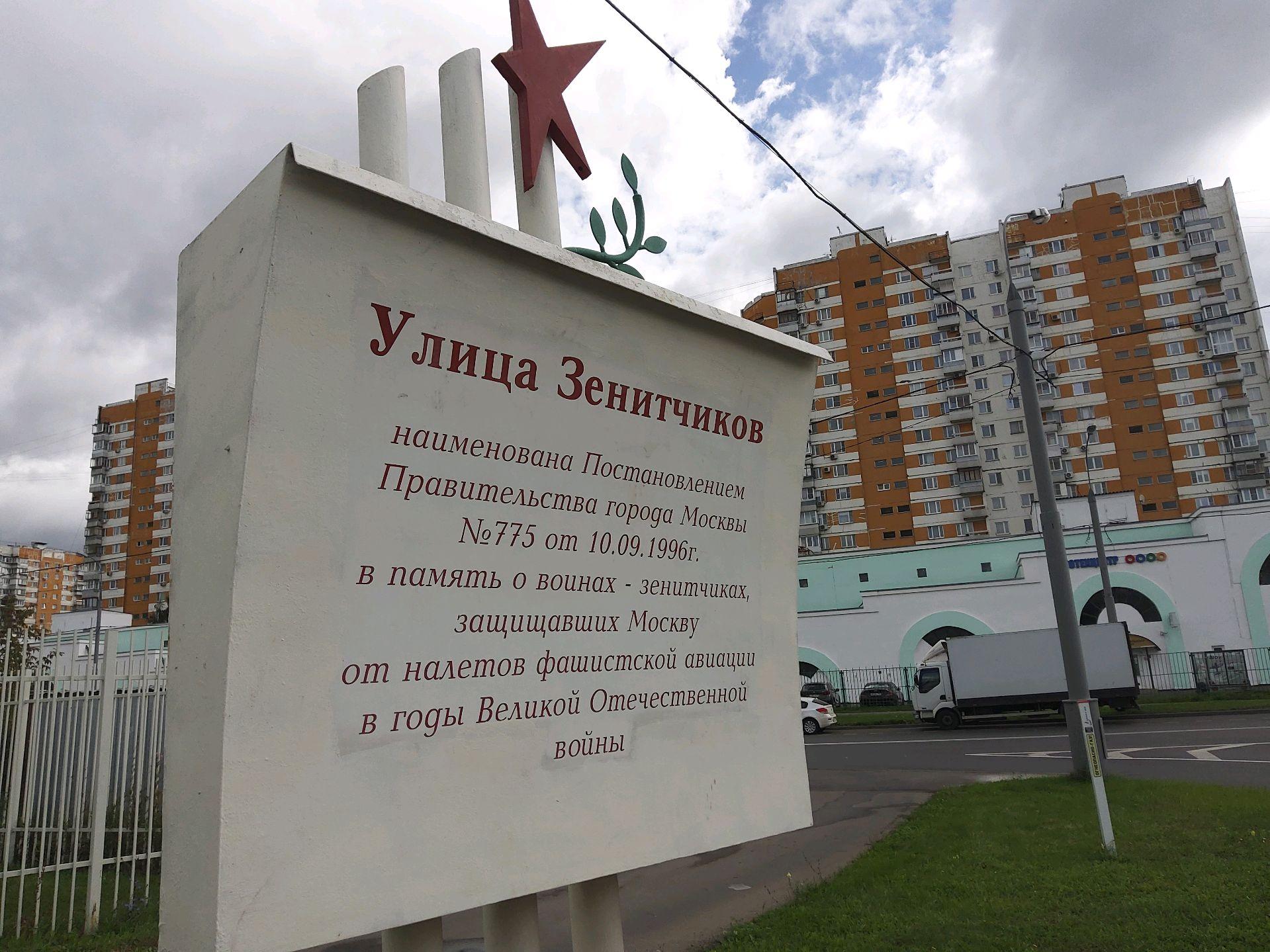 Название улица получила в 1996 году в честь дивизии ПВО, штаб которой располагался в деревне Митино. В память об этом на пересечении улиц Зенитчиков и Дубравная установлена памятная стела.