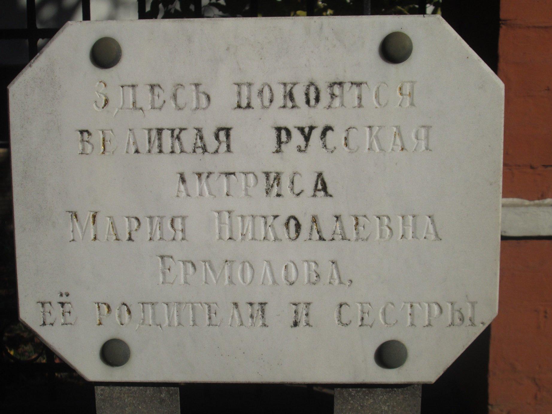 В 1928 году в ограде храма была похоронена актриса Мария Ермолова. С Владыкино связаны многие страницы ее жизни. Здесь 3 июля 1853 г. в семье суфлера московского Малого театра, выходца из крепостных, она родилась. В 1920 г. Советское правительство, по инициативе В. И. Ленина, присвоило ей звание народной артистки республики. Она была первой артисткой, получившей эту высокую награду. Здесь М. Н. Ермолова, согласно завещанию, была похоронена рядом с родителями и сестрой на старинном кладбище. Позднее ее прах был перенесен на Новодевичье кладбище в Москве (вся документация была уничтожена в 1941 году). В 1937 г. в Москве создан театр имени М. Н. Ермоловой. Получается, что у Марии Николаевны Ермоловой сразу две могилы. Одна - ухоженная на Новодевичьем, другая - на двух подпорках неприметная серая плита с полу стершимися буквами: «Здесь покоится великая русская актриса Мария Николаевна Ермолова, ее родители и сестры». И никаких дат.