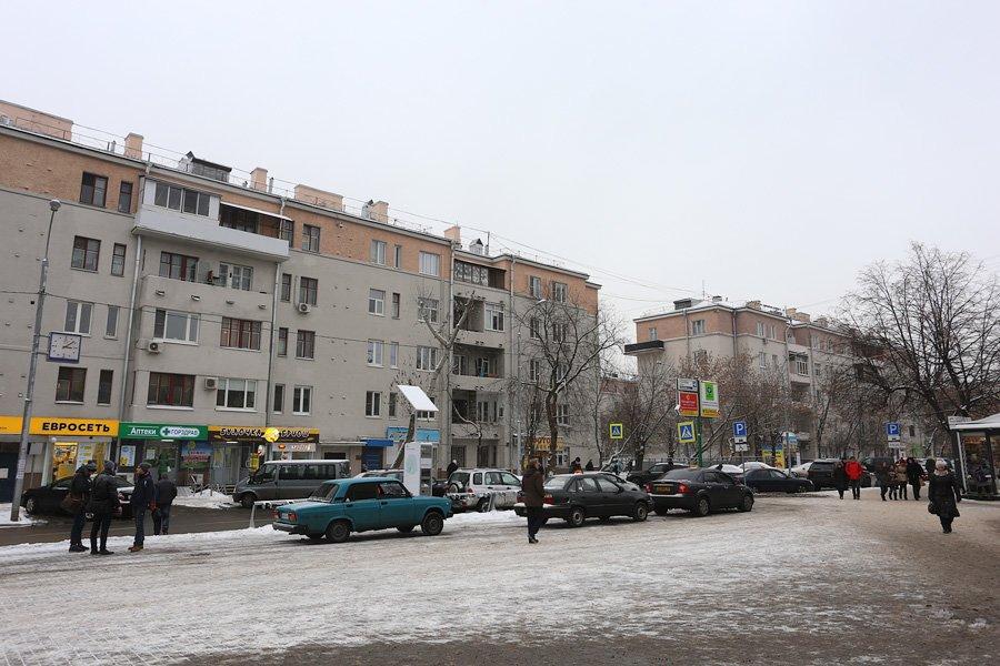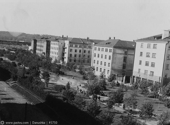 Шесть Г-образных домов поставлены по периметру квартала, внутри которого находятся еще три здания, в свою очередь, образующие протяженный двор-аллею — здесь размешались круглые клумбы, фонтан и традиционный памятник Ленину.