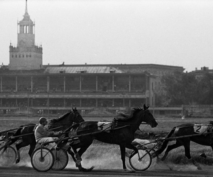1 августа 1834 г. здесь, в южной части Ходынского поля, были проведены первые рысистые бега. Официальное открытие ипподрома состоялось 12 сентября 1834 г. Через три года были сооружены первые трибуны в виде двухэтажных беседок и треугольное в плане скаковое поле. Еще через двадцать лет были устроены овальные дорожки для бегов. Популярность ипподрома заставила его владельца, Московское скаковое общество, построить новые трибуны. В 1896–1899 гг. архитекторы И.Т.Барютин и С.Ф.Кулагин. построили главное здание ипподрома. Украшенное многочисленными башенками, четырехколонным портиком и, самое главное, увенчанное скульптурами коней (скульпторы К.Клодт, С.Волнухин), новое здание весьма полюбилось москвичам.