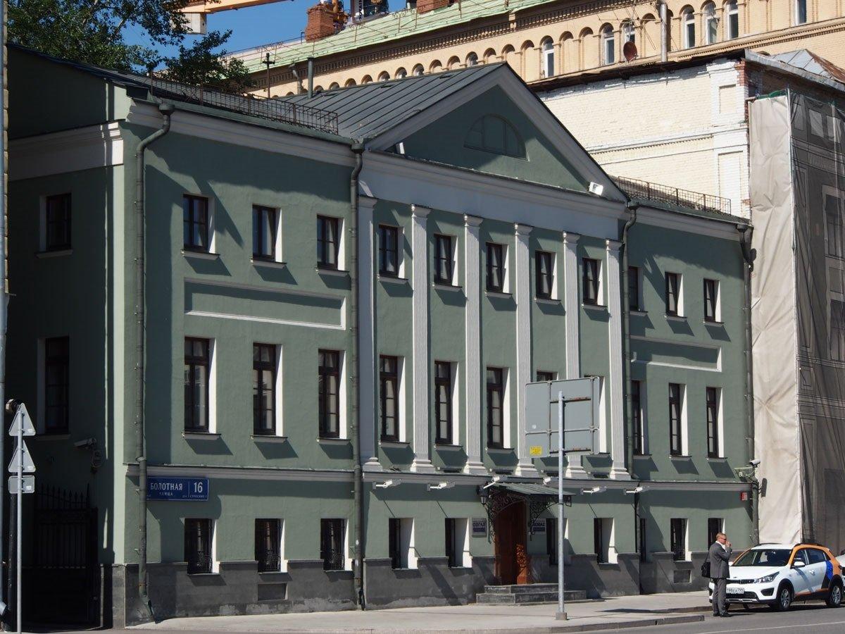 А теперь пройдемся вдоль набережной, поднимемся на Патриарший мост по направлению к Храму Христа Спасителя. Садимся на станцию метро Кропоткинская и едем до станции Смоленская Арбатско-Покровской линии. Выйдя из метро идем до переулка Сивцев Вражек, дом 44/28. Взгляните только на это здание в стиле неоклассицизма. Его фасады украшают симметричные эркеры с горизонтальными профилями, средний оформляет угол здания.