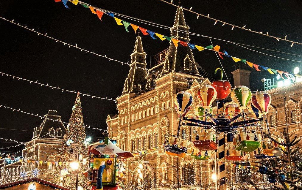 Начнем нашу прогулку в самом центре города. Посмотрите вокруг, как нарядно и ярко украшен город. Мы поговорим о традиции празднования Нового года и о его главных символах.