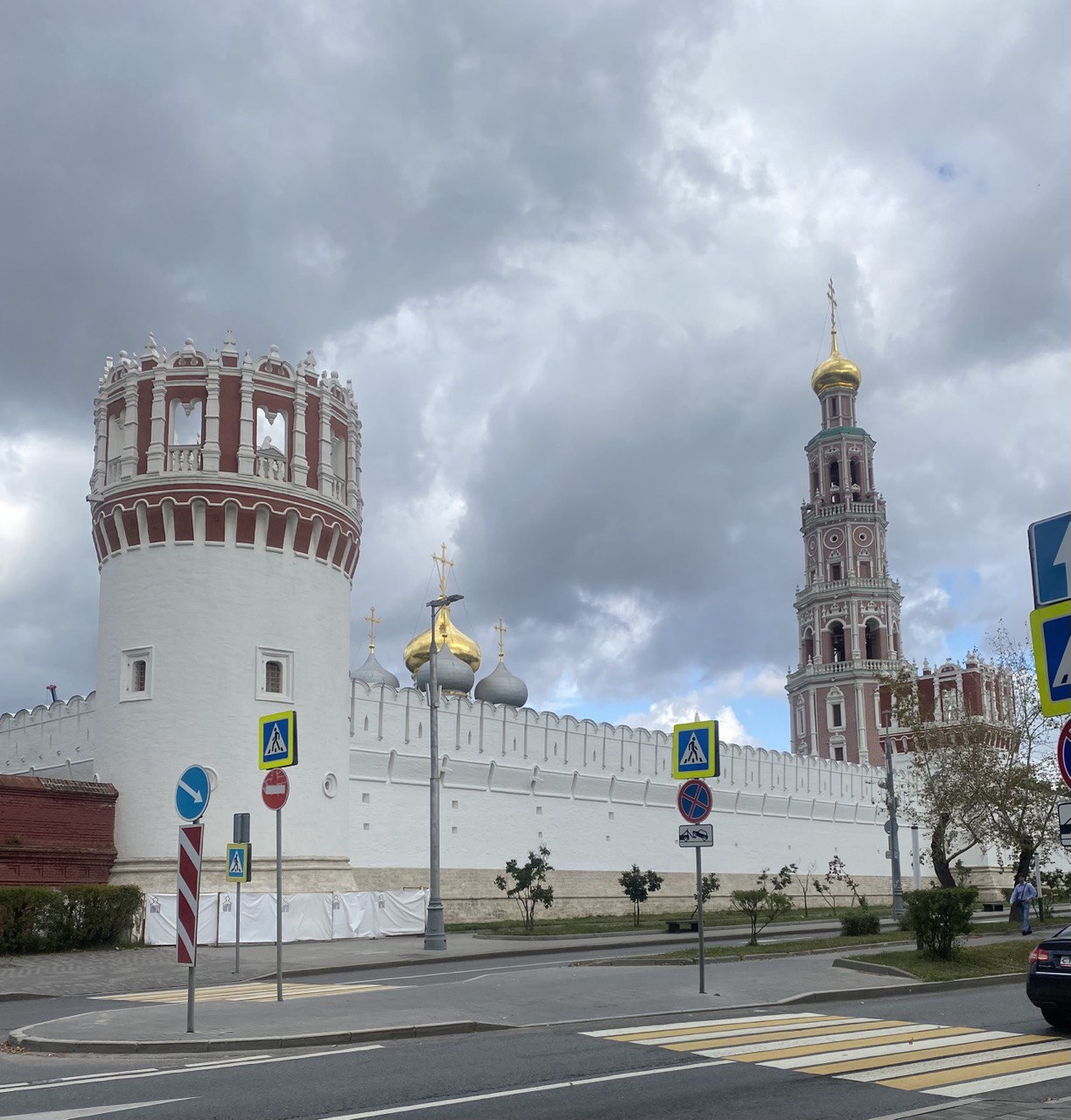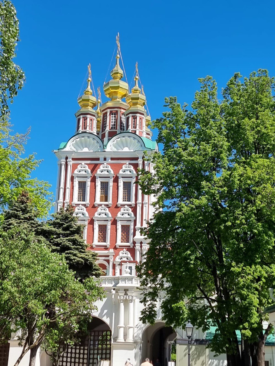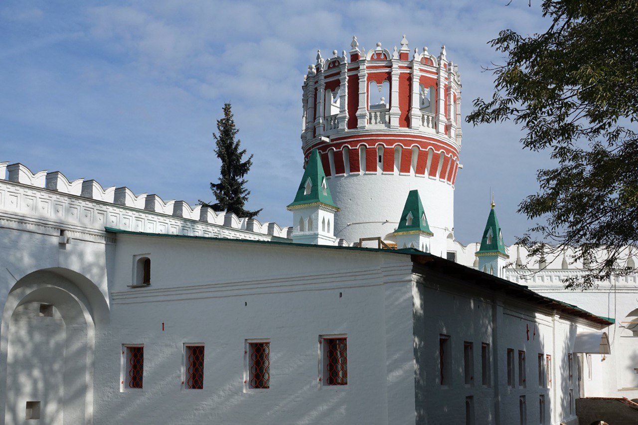 Считается, что после Смоленского собора в монастыре был возведен комплекс каменных зданий, включающий АМВРОСИЕВСКУЮ ЦЕРКОВЬ (предположительно какое-то время она выполняла роль зимнего монастырского храма), трапезную и палаты Ирины Годуновой. Эти три здания, примыкающие друг к другу, образуют меняющуюся по высоте и по ширине связку построек. Отсутствие единого внутреннего обхода помещений позволяет предположить, что некогда их объединяла система галерей и крылец, придававших постройкам живописные очертания.