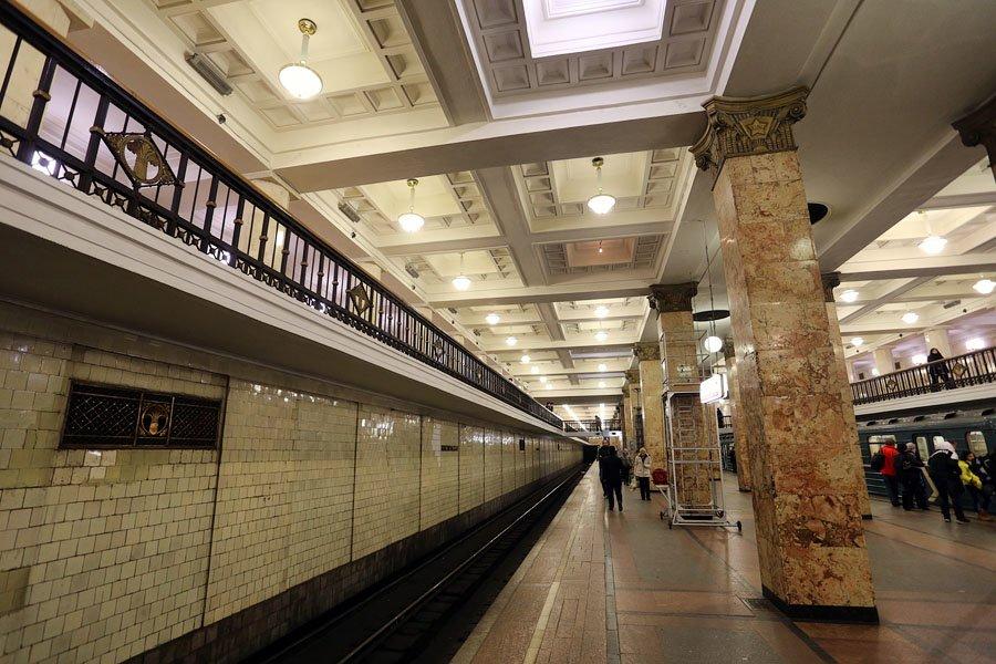 Далее мы возвращаемся на станцию «Павелецкая» и совершаем пересадку на Замоскворецкую линую. Доезжаем до станции «Новокузнецкая». Она построена по проекту архитекторов Ивана Таранова и Надежды Быковой и открыта 20 ноября 1943 года, в период строительства третьей очереди. Внутреннее оформление станции изобилует художественными элементами, отражающими в себе борьбу советского народа в Великой Отечественной войне. Между арками-порталами расположены мраморные скамьи с резным рисунком в виде наполовину развернутых свитков. Имеет место быть предположение о том, что эти скамьи были вывезены из Храма Христа Спасителя перед его сносом в 1931 году, однако подобная информация не находит официального подтверждения. Рисунок свода украшен мозаикой, выполненной В. А. Фроловым по эскизам А. А. Дейнеки в блокадном Ленинграде и доставлены в Москву по дороге жизни. Лейтмотивом мозаики стал тяжелый труд граждан Советского Союза в военное время. В теме мозаик отражен труд садоводов, сталеваров, машиностроителей, строителей, авиаторов, а также присутствуют композиции «Парад физкультурников» в вестибюле и «Лыжники».