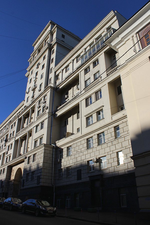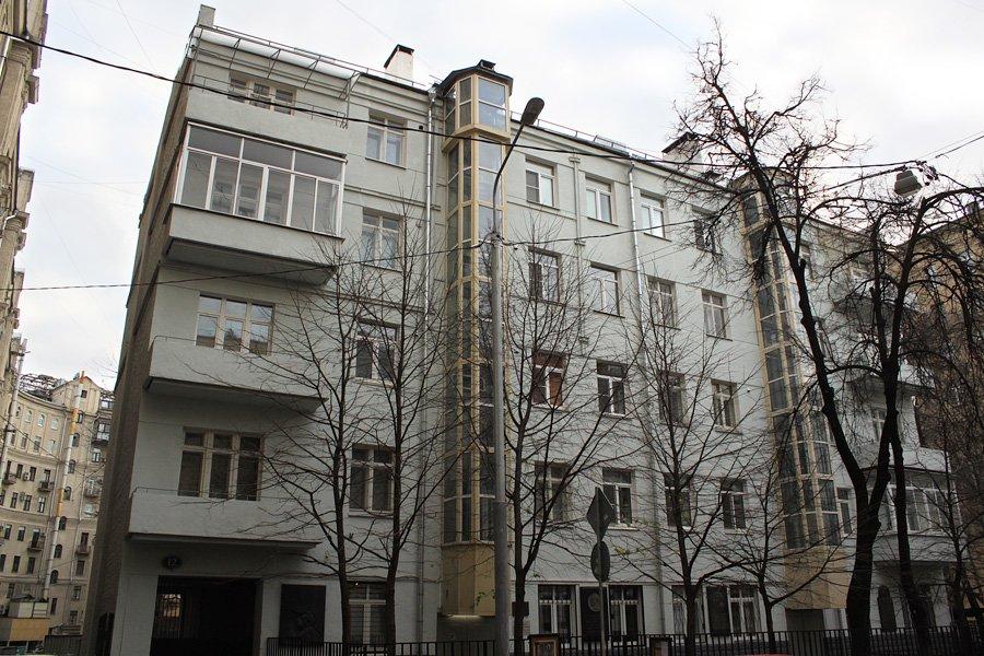 Сразу же за театром повернем направо на Глинищевский переулок. Здание под номером 5/7 строилось для жилищно-строительного кооперативного товарищества Московского Художественного академического театра и театра имени Станиславского, его заселили актеры знаменитых театров, в 1938-м в одну из квартир въехал режиссер театра В.Н.Немирович-Данченко (ныне музей-квартира). Также здесь располагалась квартира, а ныне музей актера С.В.Образцова.