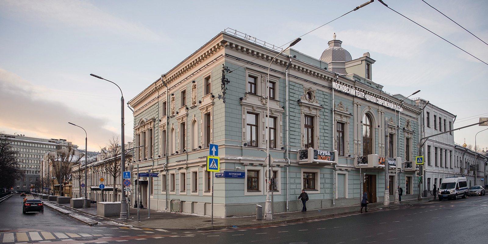 По Цветном бульвару возвращаемся на Бульварное кольцо. Здесь на углу Неглинной улице в здании известного ресторана Л.Оливье «Эрмитаж» расположился театр «Школа современной пьесы». В 2013 году в верхней части здания произошел пожар, нанесший существенный ущерб части деревянных конструкций и декоративному убранству залов. В 2018 году была завершена его реставрация.