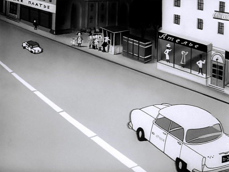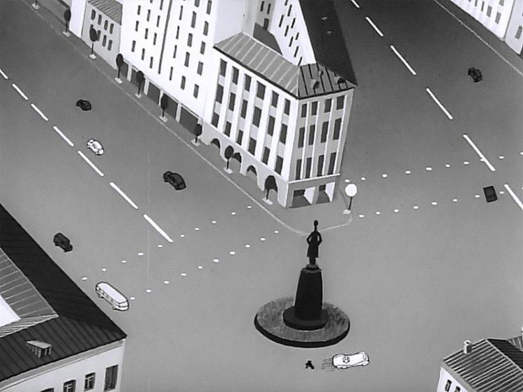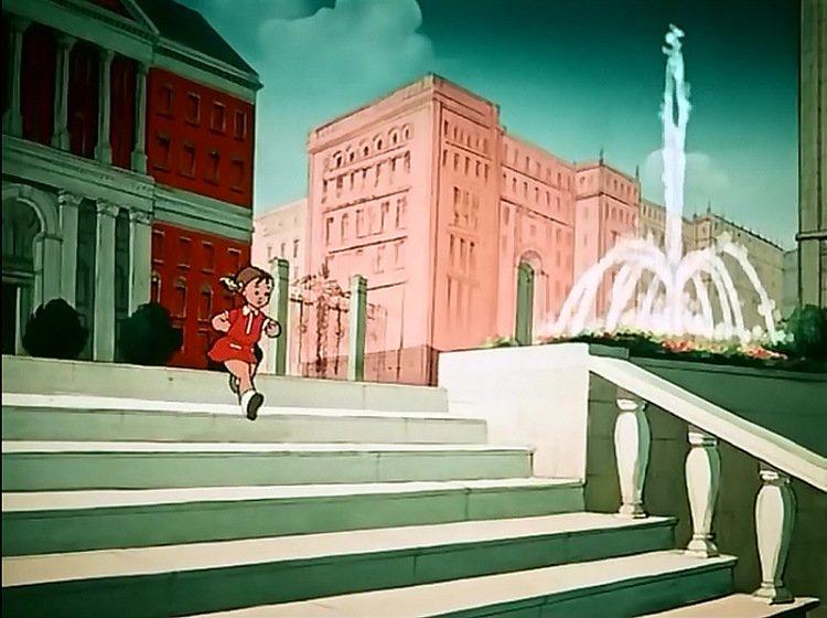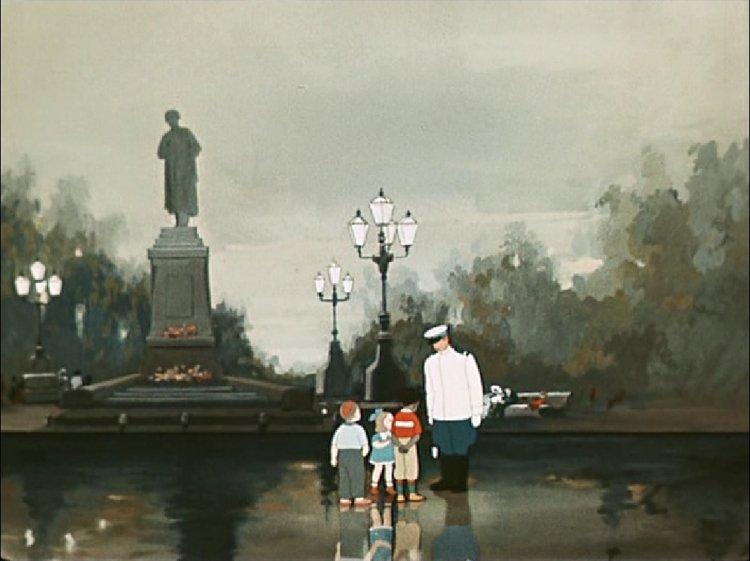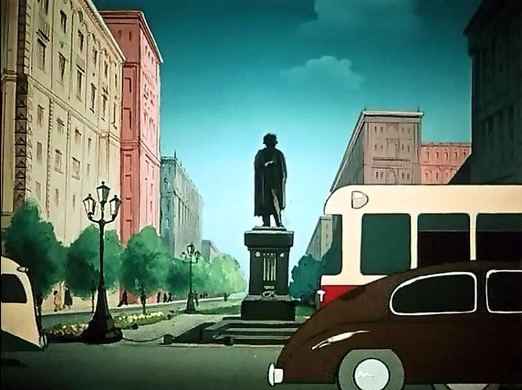 Первый раз Москва появилась в мультфильме, как практически самостоятельная героиня в 1947. Страна праздновала 800-летие столицы, и именно этому был посвящен мультфильм «Тебе, Москва!». В мультфильме наш город показан практически с фотографической точностью. Есть здесь и Пушкинская площадь. Начнем нашу прогулку от памятника Пушкину.