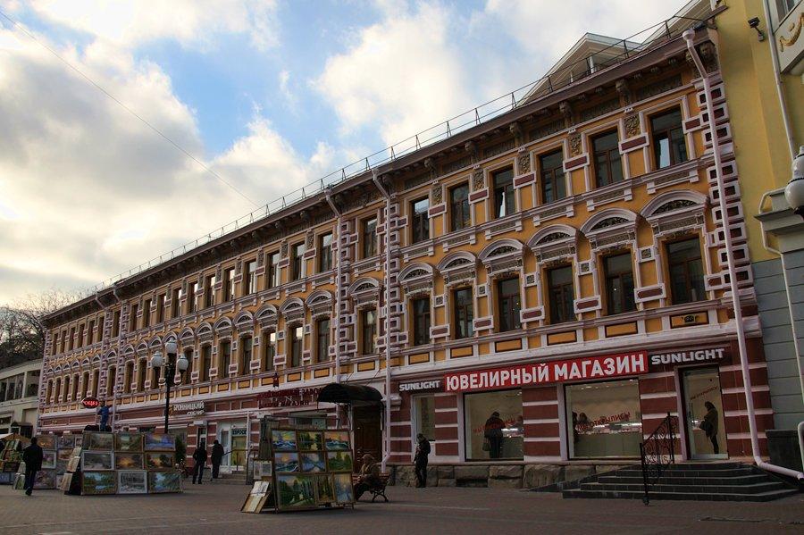 Далее двигаемся в сторону улицы Арбат, на котором необходимо обратить внимание на угловой дом под номером 2/1, который более известен, как ресторан "Прага". Здесь находится кулинария, где можно купить фирменные торты «Прага» и «Ленинградский». Именно сюда, в романе "12 стульев", Ипполит Матвеевич привел обедать Лизу: «После недолгих уговоров Ипполит Матвеевич повез Лизу в образцовую столовую МСПО «Прагу» — лучшее место в Москве, как говорил ему Бендер. Лучшее место в Москве поразило Лизу обилием зеркал, света и цветочных горшков. Лизе это было простительно — она никогда еще не посещала больших образцово-показательных ресторанов».