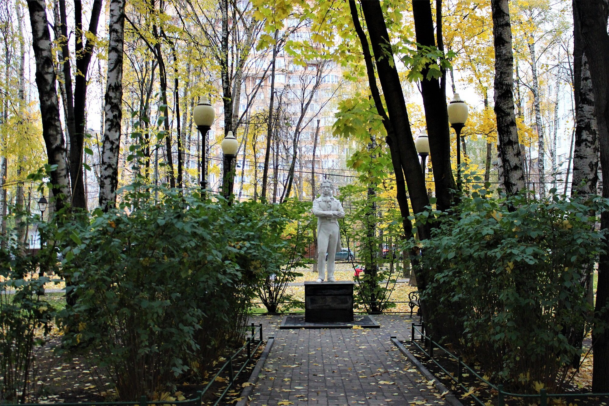 Ростовая фигура поэта из белого камня расположена немного в стороне от центральной аллеи парка. Пушкин в полный рост стоит на метровом постаменте в задумчивой позе, сложив руки на груди.