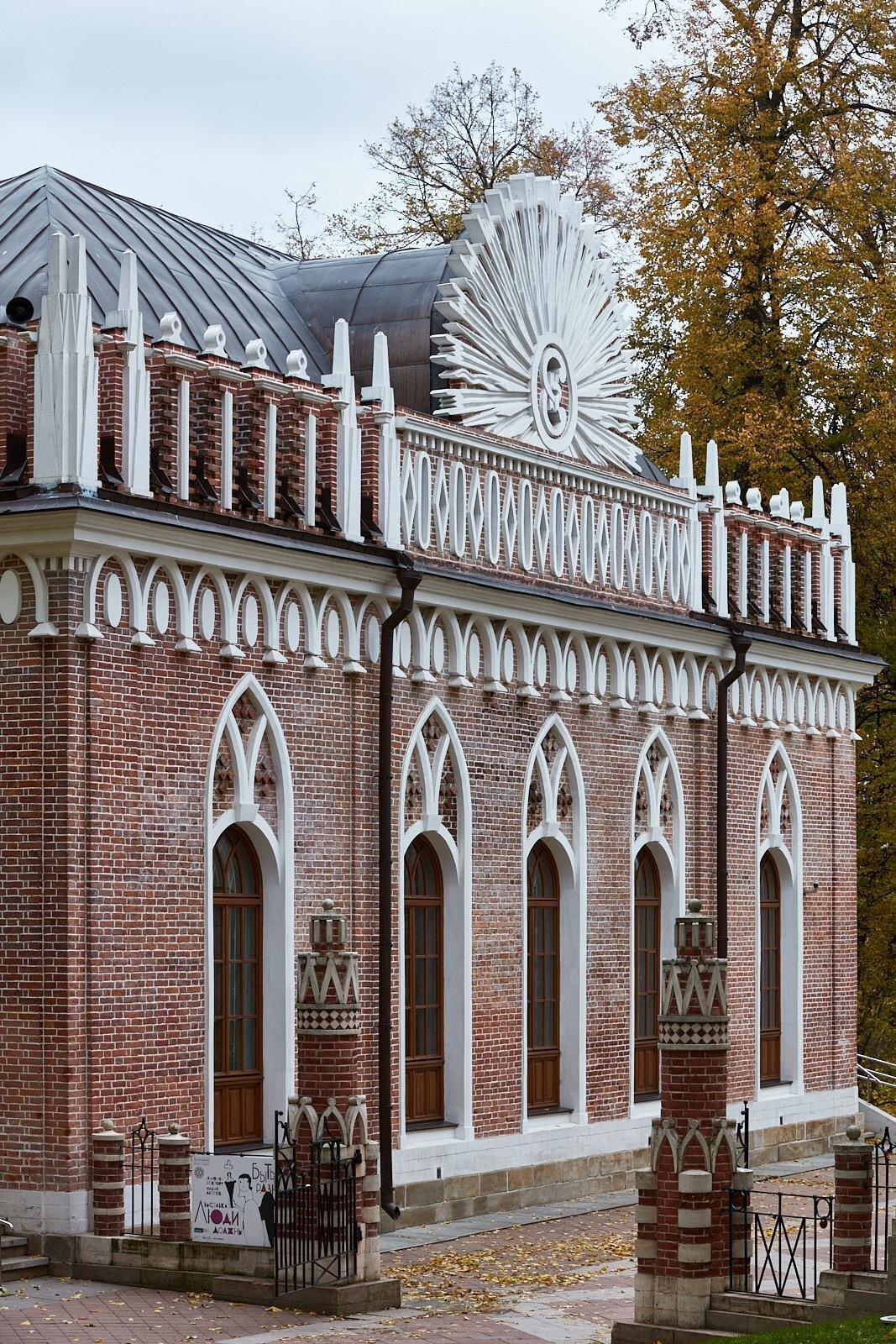 Если Вы устали, то можете пройти под аркой ко входу в выставочные залы музея-заповедника "Царицыно". Для продолижения знакомства с архитектурным ансамблем пройдите вдоль галереи-ограды к Большому дворцу.