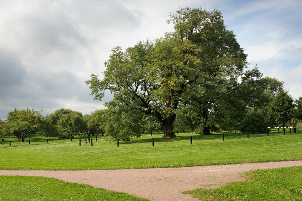 Далее, повернувшись к Домику Петра I XVIII в. спиной, мы увидим памятник природы Коломенского - Дубовую рощу.