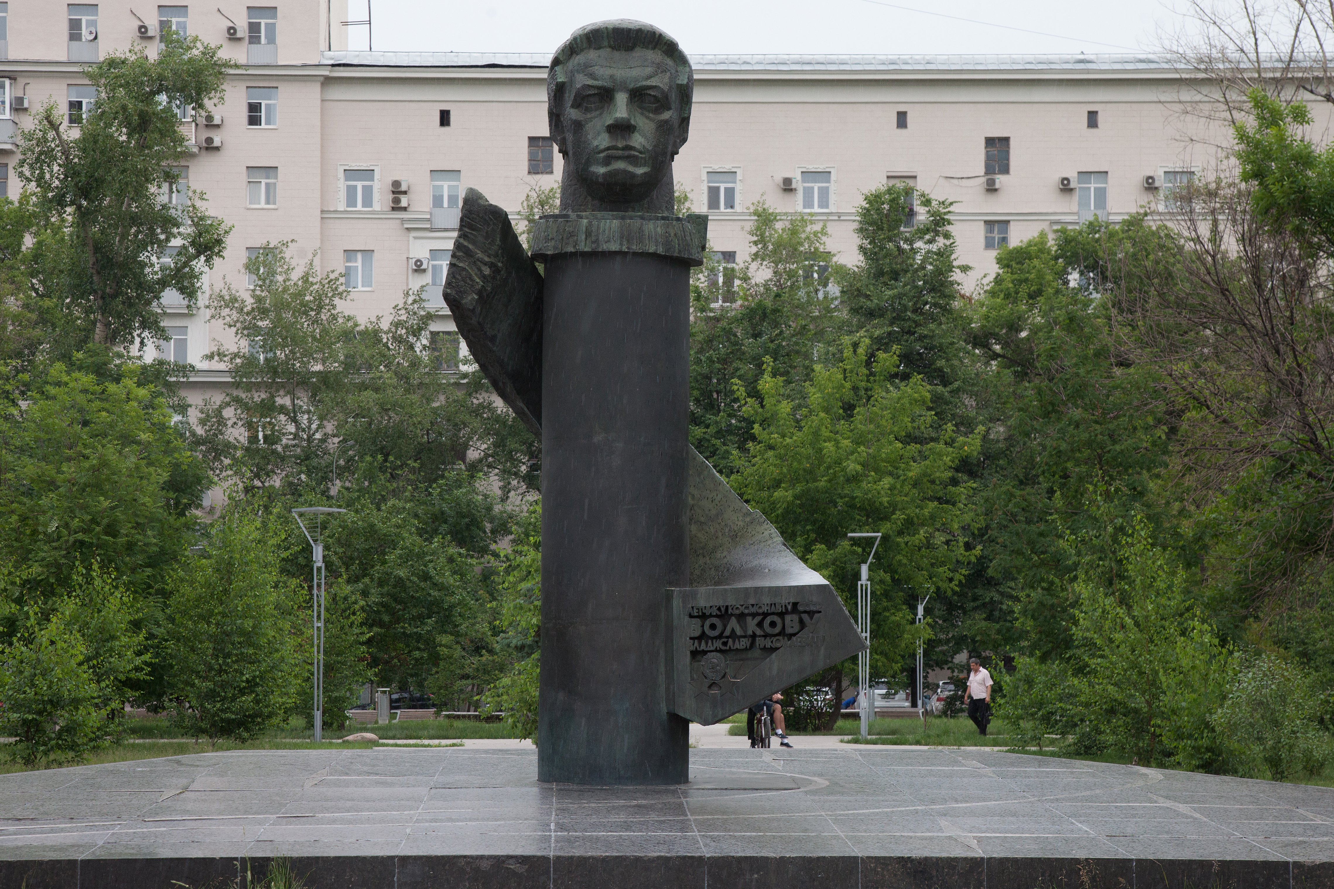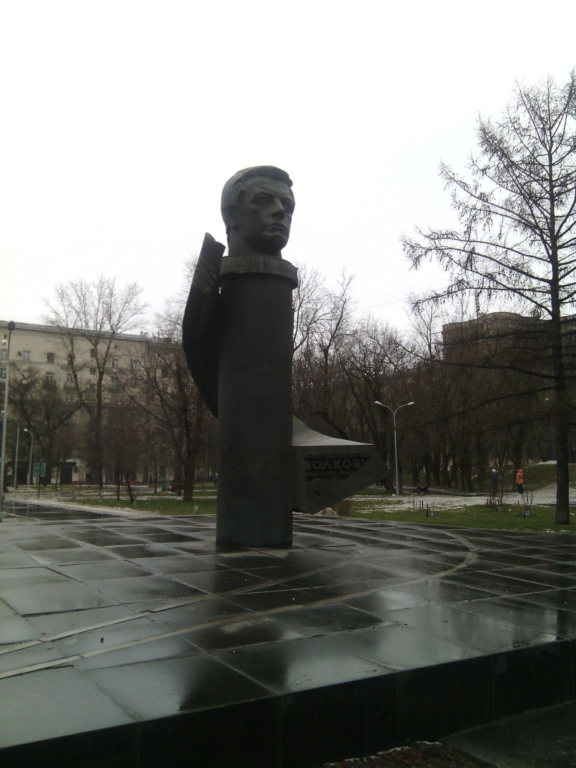 Вернемся на Ленинградское шоссе через улицу Зои и Александра Космодемьянских и направимся в сторону центра до сквера им. Космонавта Волкова. Здесь установлен Бюст Волкову В.Н. Владислав Николаевич Волков (1935—1971) — советский космонавт, дважды Герой Советского Союза (второй раз звание присвоено посмертно). Бронзовый бюст лётчика помещён на гранитный полированный цилиндрический постамент. Его огибает обрывающаяся «орбита» из того же материала, что и скульптура космонавта, и символизирует полёт Волкова на «Союзе-11», когда погиб весь экипаж корабля. На пьедестале расположена посвятительная надпись: «Летчику-космонавту Волкову Владиславу Николаевичу», а ниже изображены полученные им награды — две медали Героя Советского Союза.