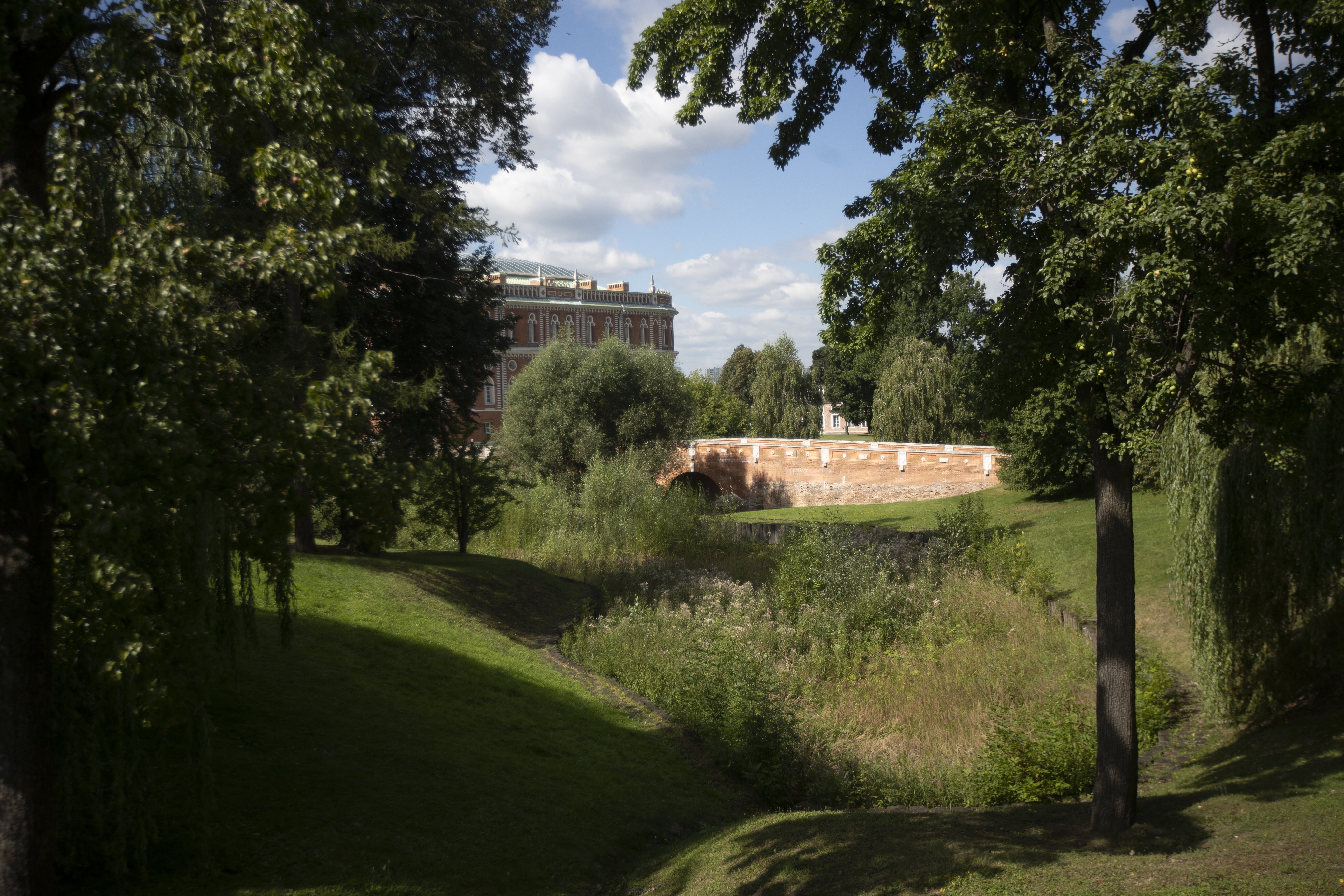 Оранжерейный мост, или «Оранжерейная плотина», был возведен в начале ХIХ века по инициативе Экспедиции Кремлевского строения по проекту архитектора Ивана Васильевича Еготова. Оранжерейный мост в верховьях Большой оврага был построен с практической целью: он должен был облегчить сообщение между Хлебным домом и Оранжерейным участком. Выше Оранжерейного моста находятся Оранжерейные пруды. Еще в середине ХVIII века в верховьях Большого оврага был устроен каскад их трех небольших прудов. Из этих прудов брали воду для полива растений в оранжереях и в «воздушном саду». В начале ХIХ века плотину пруда около Хлебного дома дополнили мостом. Оранжерейный мост довольно скромен по своей архитектуре и декору. Он выдержан в общей для царицынского ансамбля цветовой гамме и стилистике. Приземистый и одноарочный Оранжерейный мост построен из красного кирпича с белокаменным декором. Парапет моста украшен редко расположенными рельефами из белого камня. Арка моста усилена контрофорсами. К началу ХХ века Оранжерейный мост пребывал в достаточно плачевном состоянии. Пруды обмелели и покрылись густой тиной, от них остался лишь маленький ручеек на дне оврага. Оранжерейный мост был восстановлен из руин в 1998-2000 годах. Недавно были воссозданы и Оранжерейные пруды, с новой плотиной и небольшим островком. С проезжей части Оранжерейного моста можно любоваться панорамой Большого оврага и живописным видом каскада Оранжерейных прудов.